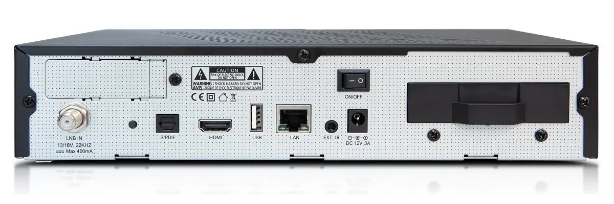 Elegancki design odbiornika wpasuje się w każdy salon. Na przednim panelu znajduje się 7-segmentowy wyświetlacz LED. Pod klapką znajdziesz 1x czytnik kart, 2x slot na moduł CI/CI+, 1x USB 2.0 i 1x slot na kartę microSD, które możesz wykorzystać jako wewnętrzną pamięć do swoich nagrań. Na tylnym panelu znajduje się wbudowany tuner satelitarny DVB-S2X oraz gniazdo na drugi tuner Plug & Play, który można wyposażyć w tuner satelitarny lub naziemny/kablowy. Oprócz wykorzystania karty microSD jako pamięci wewnętrznej, możesz z łatwością włożyć do odbiornika dysk twardy 2,5" poprzez system szuflady HDD. Na tylnym panelu znajdziesz również optyczne cyfrowe wyjście audio S/PDIF, USB 2.0, Ethernet RJ45 , gniazdo na przedłużacz IR (w zestawie z odbiornikiem), przełącznik zasilania i wejście dla zewnętrznego zasilacza DC 12V-3A.