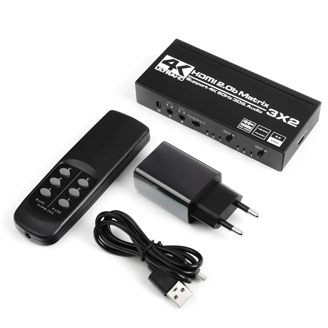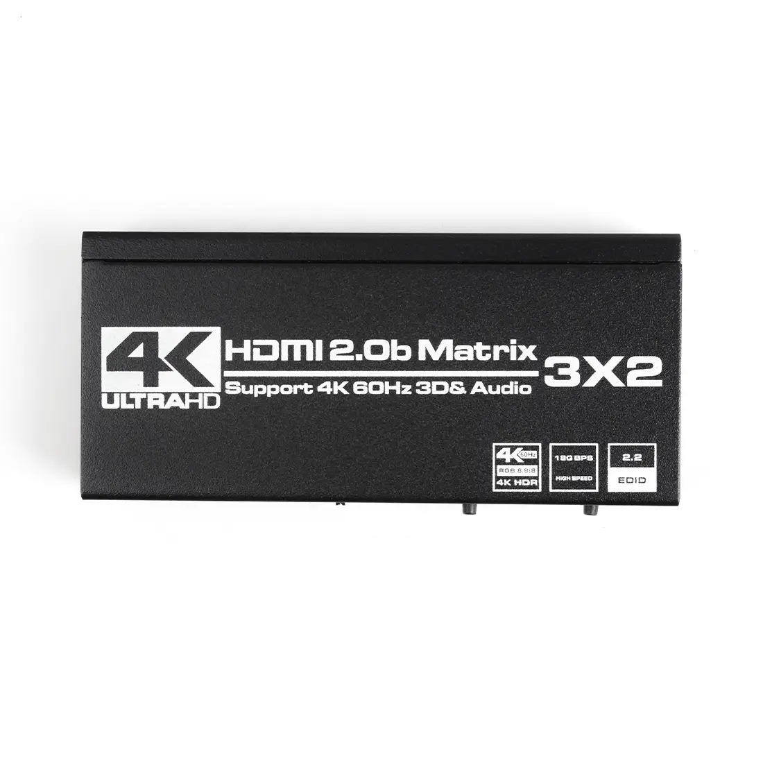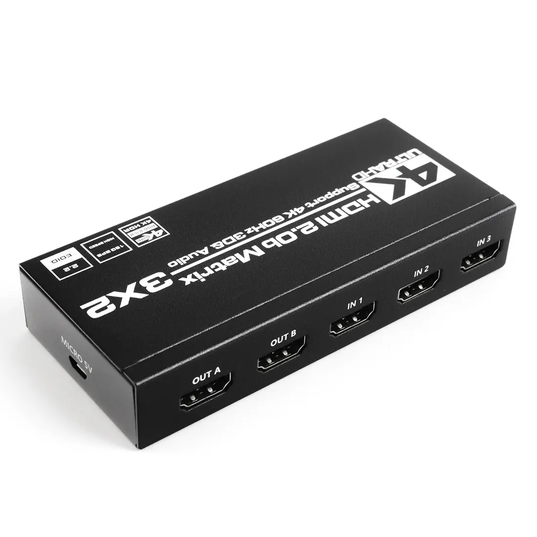 Matrix HDMI 3x2 może łączyć 3 źródła sygnału HD z 2 wyświetlaczami HD, dodatkowo urządzenie posiada wyjście toslink lub słuchawek stereo. Matrix umożliwia łatwe przełączanie lub podział dwóch urządzeń HDMI na dwa monitory lub projektory zgodne z HDMI. Porty wyjściowe mogą realizować niezależne wyjście audio przez stereofoniczny zestaw słuchawkowy. Urządzenie idealnie sprawdza się w zakresie kontroli centrum danych, dystrybucji informacji, prezentacji na sali konferencyjnej, środowisk szkolnych i szkoleniowych.
