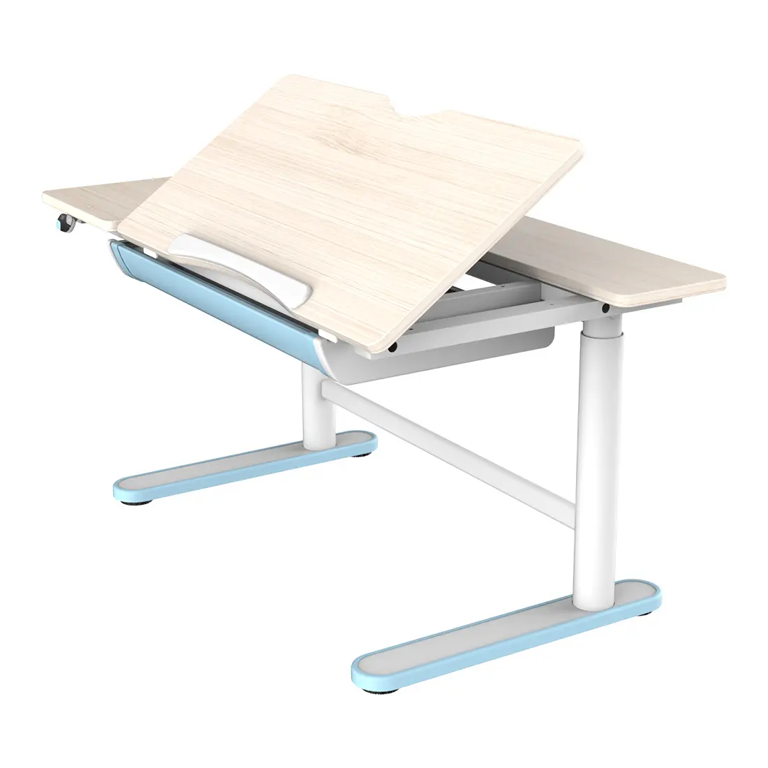 Blat biurka pozwala na wygodne ułożenie wszelkich akcesoriów oraz odpowiednie pochylenie podczas pisania, rysowania czy czytania. Możemy zauważyć, że nasze ciało inaczej układa się przy tych czynnościach - dziecko także zachowuje się w ten sposób. Blaty pochylają się nawet do 40 stopni, co ułatwia uzyskanie dogodnego kąta, podczas różnych aktywności. Dzięki tej funkcji znacząco ułatwiamy zachowanie prawidłowego ułożenia szyji i pleców podczas korzystania z biurka.
