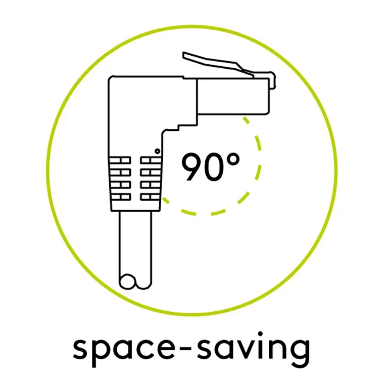 Kabel LAN typu patchcord internetowy zakończony obustronnie wtykiem RJ45 - wersja kątowa, jeden wtyk prosty, drugi kątowy 90 stopni. Ekranowany (S/FTP), kategoria przewodu 6A do 500MHz.
