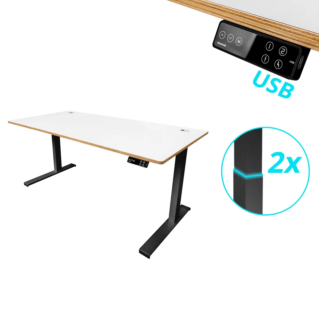 Stelaż biurkowy Spacetronik SPE-252B został wyposażony w kontroler z udogodnieniami. Regulacja wysokości blatu jest bardzo prosta i odbywa się za pomocą przycisków "góra" i "dół". Na wyświetlaczu LED będziemy mogli zobaczyć na jakiej wysokości aktualnie znajduje się blat. Kontroler ma funkcję zapamiętywania określonych wysokości, dzięki czemu możemy korzystać z gotowych ustawień dla różnych użytkowników. Dodatkowo możemy zabezpieczyć kontroler przed przypadkową zmianą wysokości. Jest to szczególnie przydatna funkcja, kiedy mamy w domu dzieci, które lubią pobawić się przyciskami. Dodatkowo został wbudowany szybki port USB, dzięki któremu możemy np. naładować telefon.