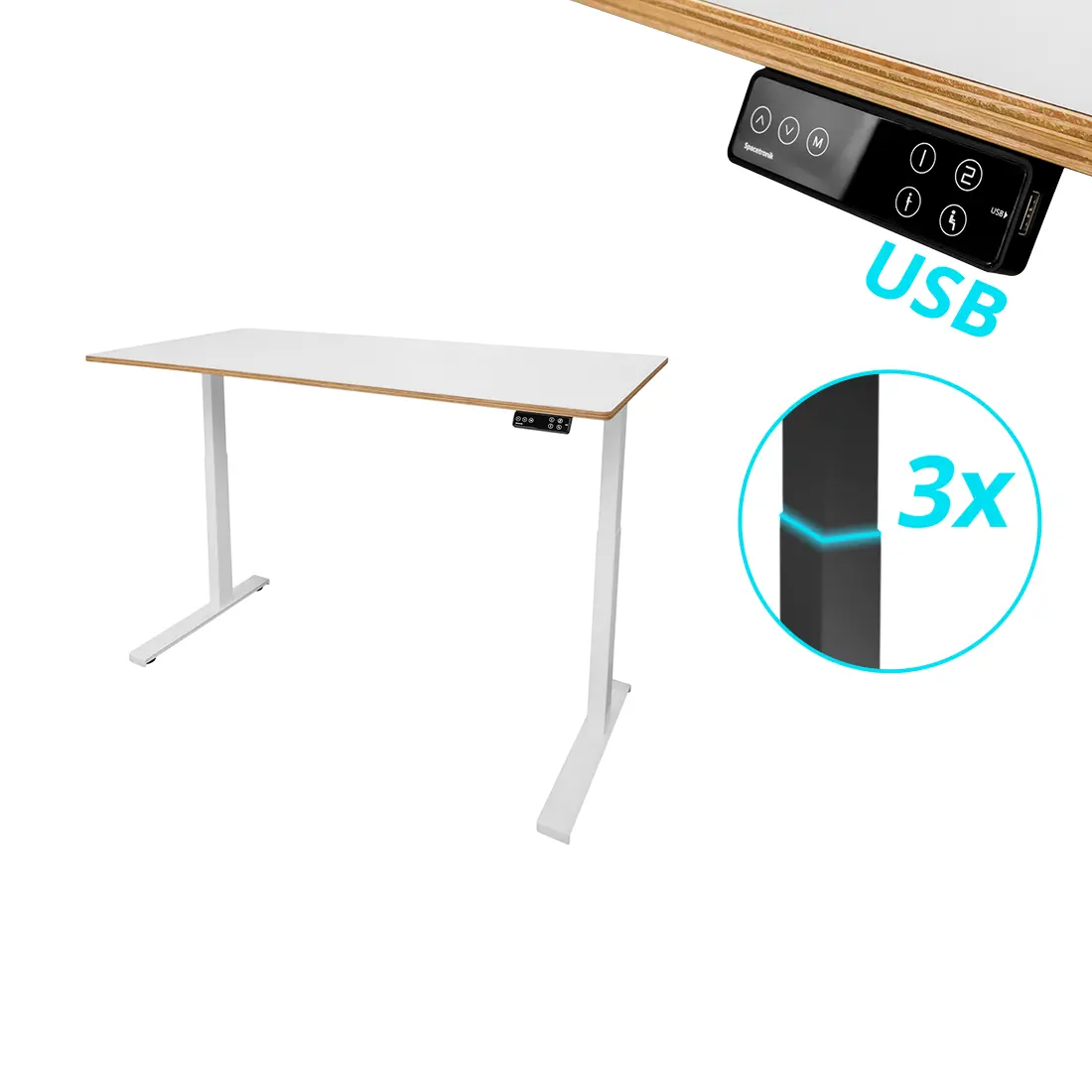 Stelaż biurkowy Spacetronik SPE-253W został wyposażony w kontroler z udogodnieniami. Regulacja wysokości blatu jest bardzo prosta i odbywa się za pomocą przycisków "góra" i "dół". Na wyświetlaczu LED będziemy mogli zobaczyć na jakiej wysokości aktualnie znajduje się blat. Kontroler ma funkcję zapamiętywania określonych wysokości, dzięki czemu możemy korzystać z gotowych ustawień dla różnych użytkowników. Dodatkowo możemy zabezpieczyć kontroler przed przypadkową zmianą wysokości. Jest to szczególnie przydatna funkcja, kiedy mamy w domu dzieci, które lubią pobawić się przyciskami. Dodatkowo został wbudowany szybki port USB, dzięki któremu możemy np. naładować telefon.
