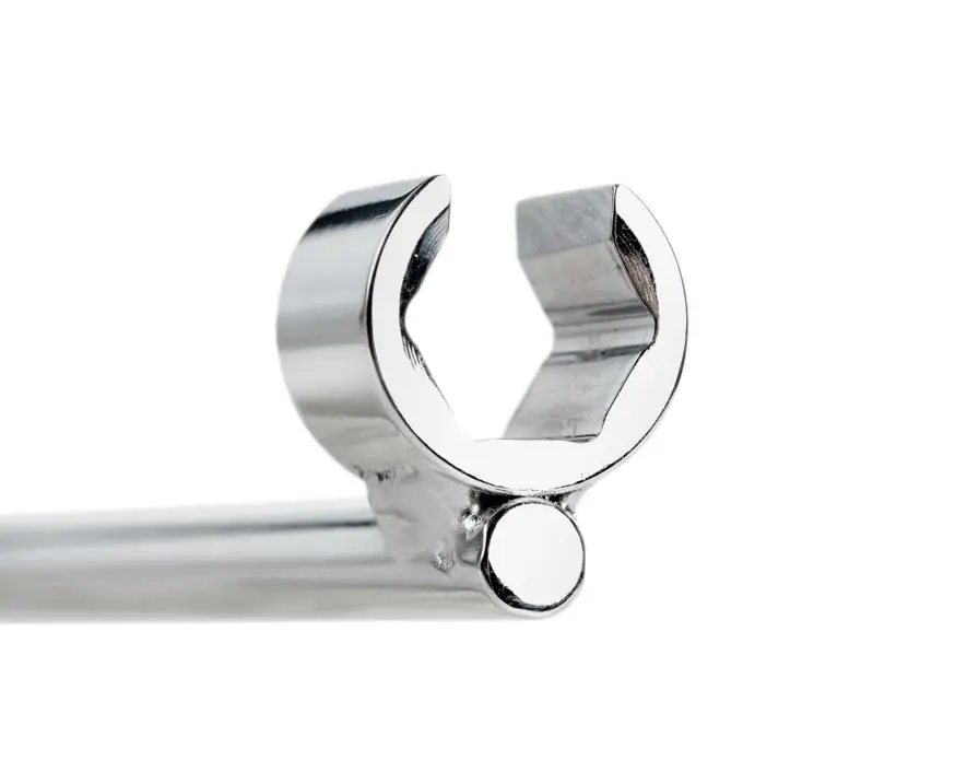 Narzędzie z nakrętką na podstawie uchwytu i krótką główką z wytrzymałym spawem, zaprojektowane aby zapewnić łatwy dostęp do instalowania lub usuwania złączy F w miejscach o dużej gęstości.