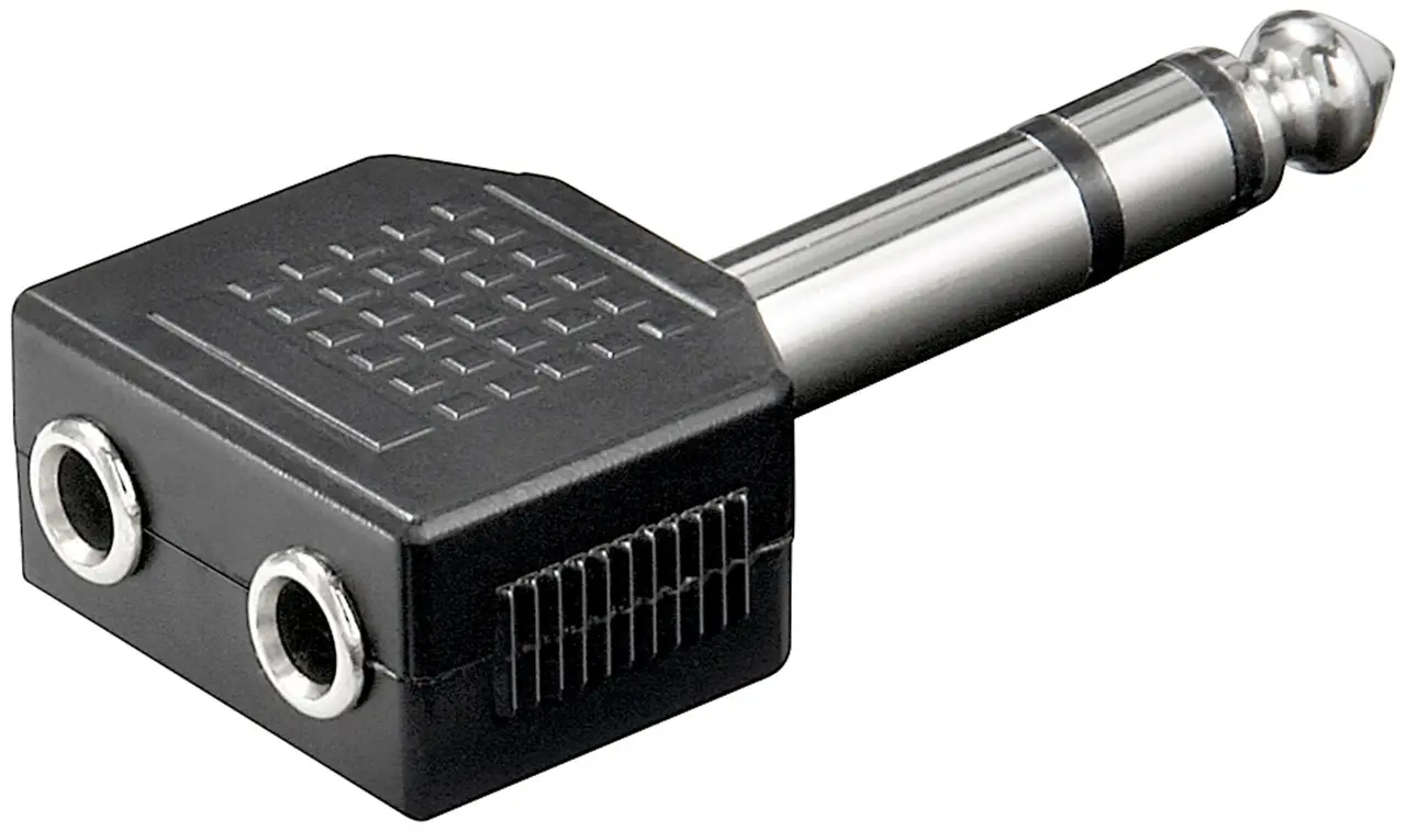 Adapter, łącznik dwóch gniazd Jack 3,5mm (minijack, mono) na jeden wtyk Jack 6,35mm (duży jack, stereo).