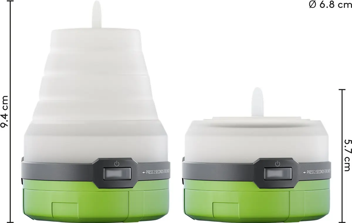 Wielofunkcyjna lampka lub latarka wyposażona w LED-owe źródło światła. Idealna towarszyszka do namiotu, kampera, na biwak - zasilana bateryjnie (3x AAA, brak w komplecie). Lampa 3w1, może służyć jako lampka biurkowa, lampka wisząca lub po prostu jako latarka (lampka przenośna). Po złożeniu zmieści się do każdej torby lub plecaka. Lampka może pracować w czterech trybach, np. mocne światło białe, słabe światło białe, światło kolorowe i światło imitujące płomień świeczki. Latarka jest odporna na zachlapanie, spełnia normę IPX4, wyposażona także w karabińczyk do zawieszania. Uruchamiana poprzez przytrzymanie przycisku WŁ/WYŁ przez około 2 sekundy, aby uniknąć przypadkowego wyłączenia lub włączenia latarki.
