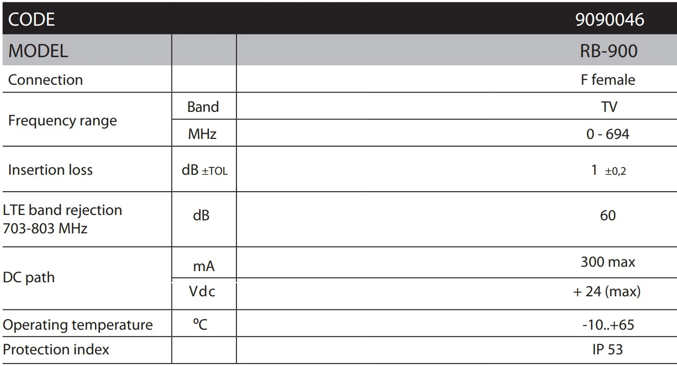 Filtr odcinający zakłócenia z sygnałów telefonii komórkowej LTE700, LTE800, GSM i TETRA. Zawiera ścieżkę DC, aby umożliwić zasilanie przedwzmacniacza. Nadaje się do indywidualnych i zbiorowych instalacji telewizji naziemnej, w których występuje transmisja sygnału telefonii komórkowej LTE700 i LTE800 w paśmie 703-862 MHz oraz transmisja sygnału GSM i TETRA w paśmie 870-960 MHz. Filtr eliminuje sygnały interferencyjne przed wzmocnieniem sygnału telewizyjnego, uzyskując tłumienie w paśmie LTE700 i LTE800 do -60dB.