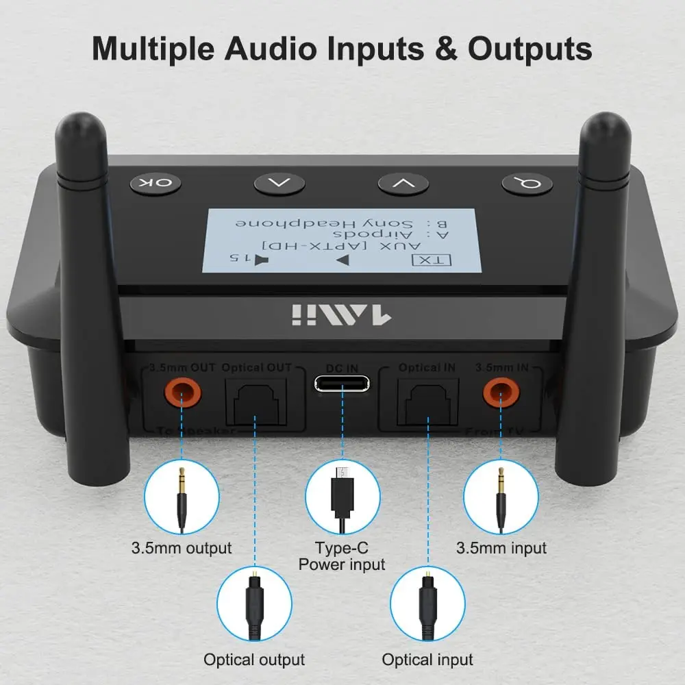 Odbiornik nadajnika Bluetooth dalekiego zasięgu 1Mii B03+ obsługuje cyfrowe wyjścia / wejścia audio OPTICAL / AUX 3,5 mm / RCA, dzięki czemu jest kompatybilny z 99% telewizorów, domowych odbiorników stereo, projektorów itp. dostępnych na rynku.