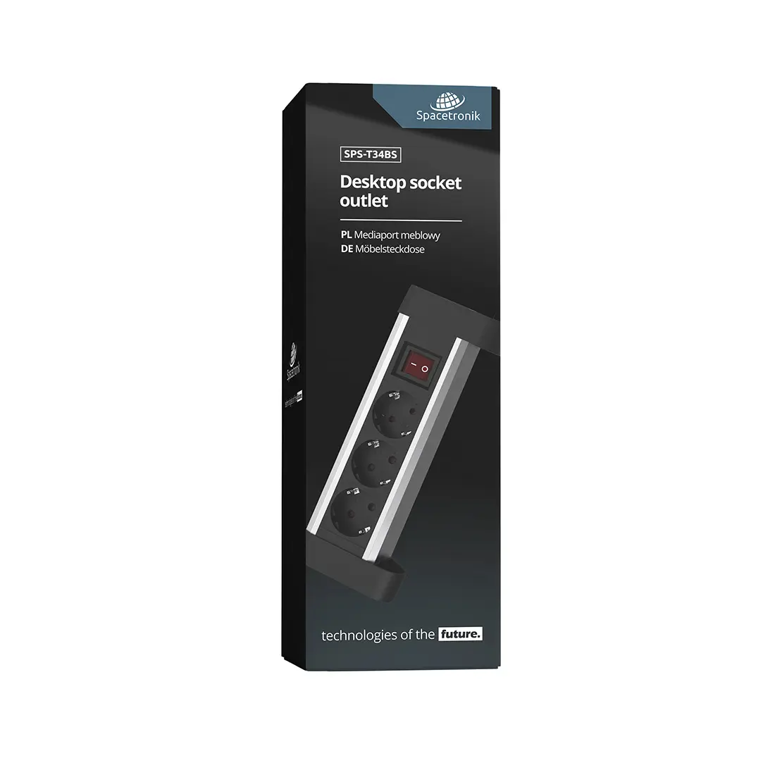 Gniazdo meblowe Spacetronik ERGOLINE SPS-T34BS to nowoczesne rozwiązanie, które znajduje zastosowanie w sklepach, salonach sprzedaży, salach konferencyjnych, biurach, a także w domu. Listwa prądowa została wykonana z aluminium i wysokiej jakości komponentów. Listwa zasilająca do komputera jest przeznaczony do montażu wewnątrz pomieszczeń w biurkach, blatach i stołach, zarówno w pozycji pionowej, jak i poziomej, zapewniając dostęp do gniazd. Gniazdo do blatu zostało wyposażone w 3 porty 110-250 V (typ Schuko) oraz przełącznik zasilania.