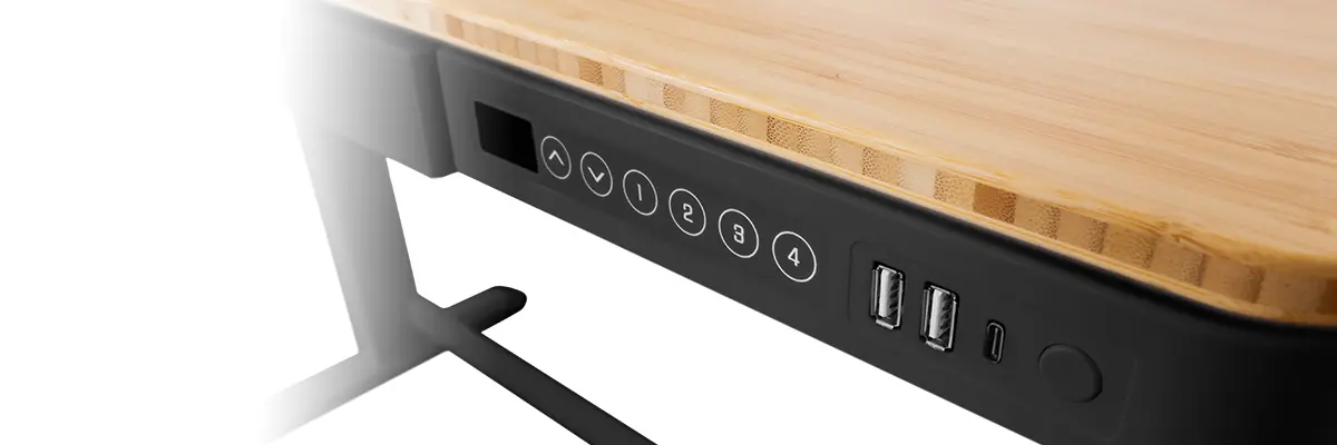 Dosłownie wszystko w jednym miejscu. Biurko zostało wyposażone w sterownik posiadający wyświetlacz LED, przyciski do manualnej zmiany pozycji, 4 programowalne przyciski zapamiętujące pozycje, 2 porty USB, port USB-C oraz funkcję kontroli rodzicielskiej.
