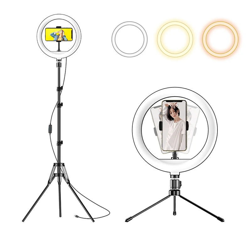 Lampa ring o przekątej 25 cm posiada aż 120 żarówek. Jasność jest regulowana na 10 poziomach i dostępne są trzy tryby świecenia: kolor bialy, żółty oraz mieszany.