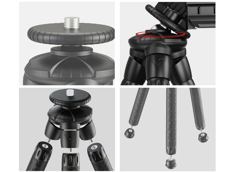 Każda noga tripoda posiada odkręcaną nakładkę, pod którą kryją się dodatkowe śruby mocujące 1/4''. Dzięki temu zamontujesz łącznie aż do czterech urządzeń. Twórz jeszcze lepsze treści i zainstaluj lampę, mikrofon.