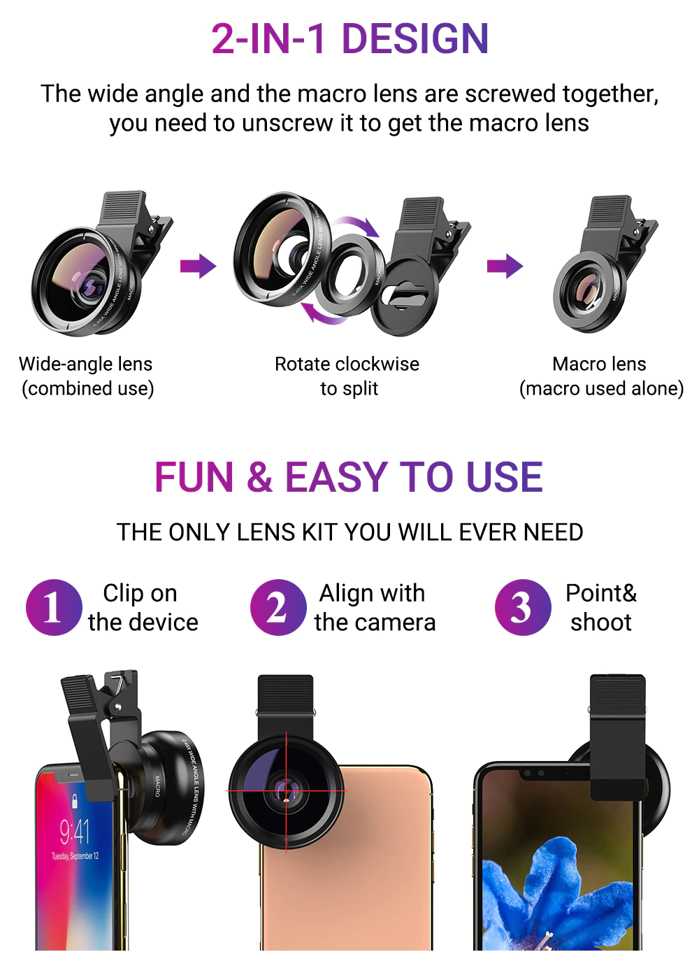 Zestaw 2 obiektywów do telefonu to coś, co powinien posiadać każdy fan fotografii mobilnej. W etui znajdziesz soczewki dopasowane do każdej sytuacji. Sprawdzą się one zarówno w podróży jak i na wydarzeniach, sesjach portretowych, w lesie lub podczas fotografowania jedzenia. Wysokiej jakości soczewki posiadają powłoki antyrefleksyjne, które zapewniają wyraźny i ostry obraz oraz doskonalne odzwierciedlają kolory. Obiektywy są niezwykle uniwersalne i mogą być używany z większością telefonów, tabletów i innych urządzeń mobilnych.