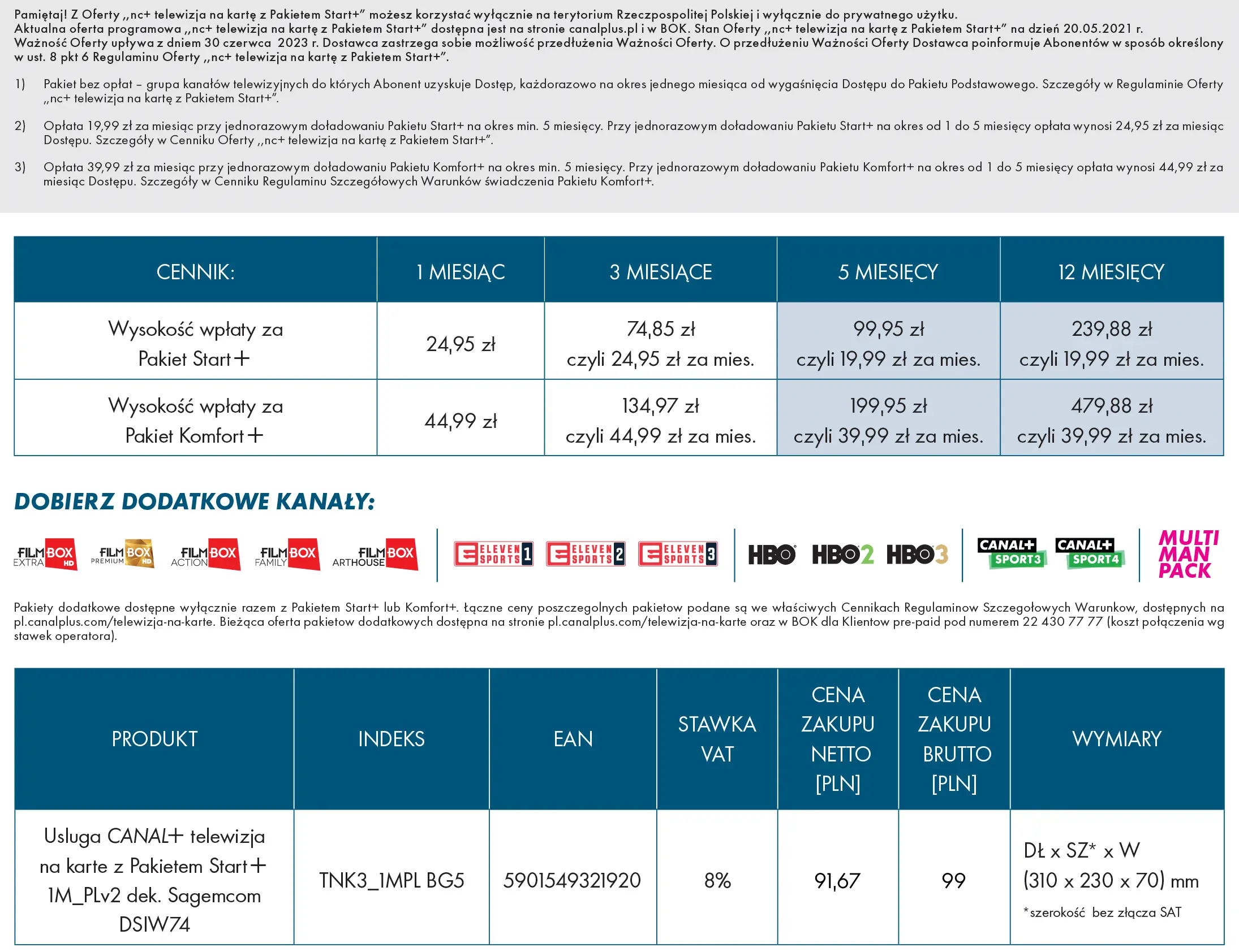 - pozostanie w ofercie "NC+ telewizja na kartę z pakietem Start+" z dostępem do 83 kanałów w tym 44 w jakości HD, na zasadach pre-paid (bez zobowiązań) w cenie od 19,99 zł/msc (przy jednorazowym doładowaniu na 5 miesiący);