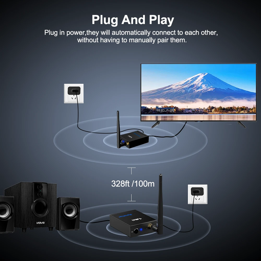 Usuń kable między dwoma urządzeniami audio Jeśli chcesz słuchać muzyki na głośniku ściennym lub głośniku podwórkowym, ale nie chcesz tylu kabli, bezprzewodowy nadajnik i odbiornik TV to najlepsze rozwiązanie do podłączenia subwoofera / odtwarzacza CD / komputera / MP4/głośnik i domowy zestaw stereo bezprzewodowo.