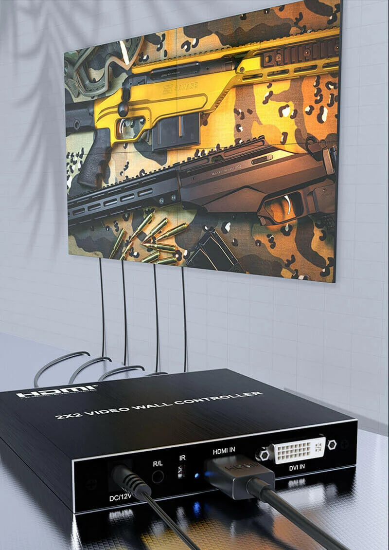 Kontroler ściany 2x2 pozwalający na przesyłanie sygnału Video z portu HDMI lub DVI i wyświetlaniu na odbiornikach HDMI w różnych konfiguracjach. Pozwala na stworzenie dużego i dynamicznego obrazu tworząc ścianę z 4 odbiorników. Urządzenie obsługuje kable do 5m na wejściu i wyjściu oraz rozdzielczość 1920x1080p@60Hz.