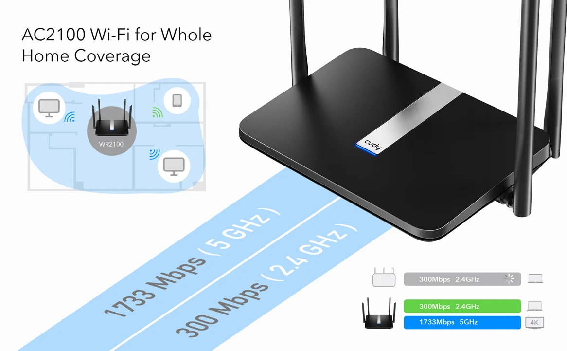 Router WiFi Cudy WR2100 pozwala na pobieranie danych do 1733 Mbps przy 5GHz i 300 Mbps w paśmie 2.4GHz. Przekłada się to na błyskawiczne ładowanie stron internetowych, komfortowe oglądanie wideo w sieci czy słuchanie muzyki za pośrednictwem serwisów streamingowych. Pliki ściągną się w mgnieniu oka. Jest to więc doskonałe urządzenie nie tylko do użytku domowego, ale także na potrzeby średniej wielkości firmy. Urządzenie umożliwia podpięcie kolejnych 4 urządzeń przy użyciu standardowego portu LAN i modemu lub kolejnego urządzenia za pomoca portu LAN / WAN. Poprzesz WiFi podłączonych urządzeń może być nawe kilkadziesiąt! Ta funkcjonalność doskonale sprawdzi się, gdy często pracujesz w terenie i potrzebujesz udostępnić internet mobilny dla kilku urządzeń jednocześnie.