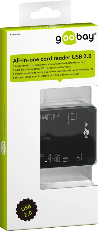 Czytnik wyposażony w sześć slotów na karty pamięci. Obsługuje wszystkie najpopularniejsze typy kart. Posiada wyprowadzony kabel USB pozwalający na podłączenie go do np. komputera.