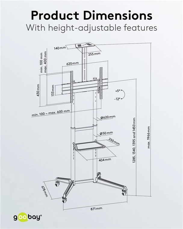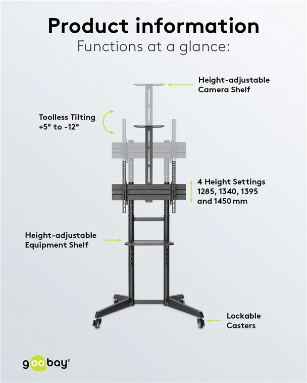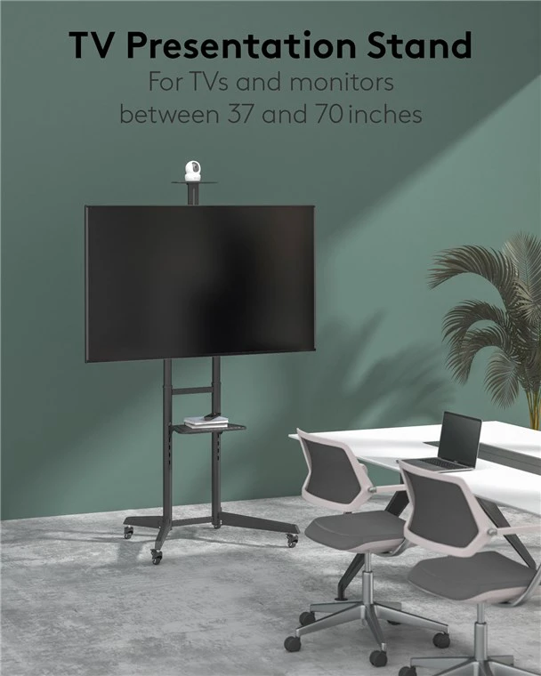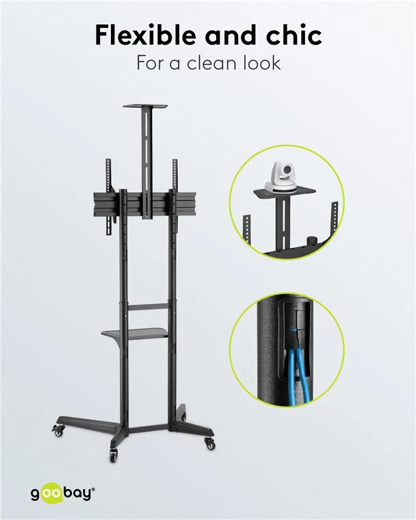 Ten wózek wyposażony w kółka to idealne rozwiązanie do sal konferencyjnych, pokazów, szkoleń itp. Pozwala na zamontowanie telewziora lub monitora w rozmiarze od 37 do 70 cali i masie do 50kg. Maksymalny rozstaw VESA to 600x400 mm. Każde z kółek posiada blokadę, dzięki temu stand jest bezpieczny i nie przesunie się niespodziewanie w żadnym kierunku. Wysokość zawieszonego telewziora można regulować aż w czterech stopniach. Uchwyt posiada róznież regulację pochyłu oraz dodatkową półkę na np. aparat lub kamerę wideo.