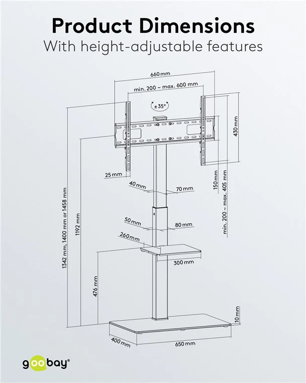 Ten stand to idealne rozwiązanie do sal konferencyjnych, pokazów, szkoleń itp. Pozwala na zamontowanie telewziora lub monitora w rozmiarze od 37 do 70 cali i masie do 40kg. Maksymalny rozstaw VESA to 600x400 mm. U dołu posiada płaską platformę dla zachowania równowagi w pionie, na której można ustawić np. komputer, odtwarzacz lub zestaw Hi-Fi. Wysokość zawieszonego telewziora można regulować w czterech stopniach. Uchwyt posiada róznież regulację pochyłu.