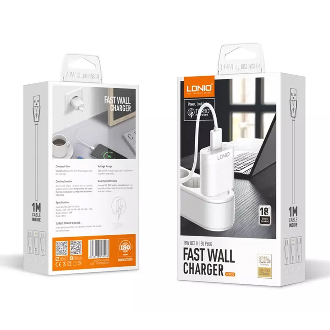LDNIO A303Q to urządzenie, które umożliwia szybkie i wygodne ładowanie akumulatorów w urządzeniach przenośnych takich jak smartfony, tablety czy też inne gadżety. Ładowarka jest wyposażona w port USB-A, dzięki czemu można ją podłączyć do większości popularnych urządzeń. Ładowarka posiada również funkcję Quick Charge 3.0, co oznacza, że urządzenie jest w stanie szybko i efektywnie naładować akumulatory o dużej pojemności. W zestawie jest także kabel USB-A na Lighting o długości 1m. Mocna ładowarka USB