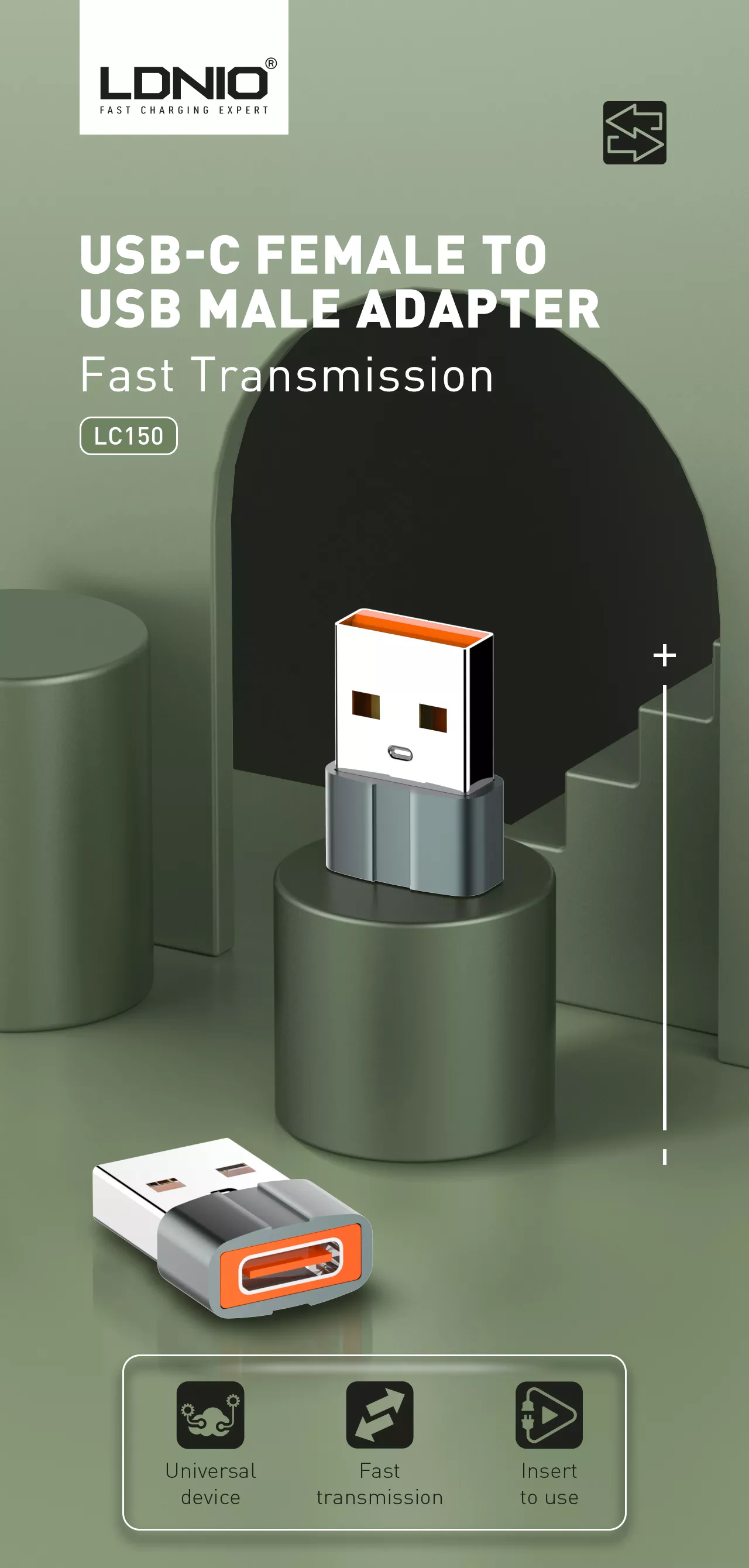 Adapter USB LDNIO LC150 to uniwersalne rozwiązanie w przypadku, kiedy posiadasz kabel USB-C, a wejście w urządzeniu jest typu A. Nie musisz kupować kolejnego kabla - wystarczy, że będziesz mieć małą, elegancką przejściówkę, której możesz użyć w każdej sytuacji. Adapter obsługuje funkcję szybkiej transmisji, więc jest kompatybilny nawet z kablami i ładowarkami QuickCharge.