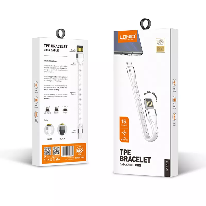 Kable szybkiego ładowania marki LDNIO, obsługuje szybkie ładowanie i transmisję danych. Został zaprojektowany tak, aby posłużył użytkownikowi jeszcze dłużej! Ulepszony i wzmocniony interfejs może wytrzymać wielokrotne zginanie lub wyginanie, aby uniknąć złamania. Podczas produkcji wykorzystano przyjazne dla środowiska materiały, które są miękkie, elastyczne. Przewód charakteryzuje się szybszą przewodnością. Technologia FAST CHARGING pozwala naładować smartfon szybciej niż tradycyjne kable USB do telefonu.