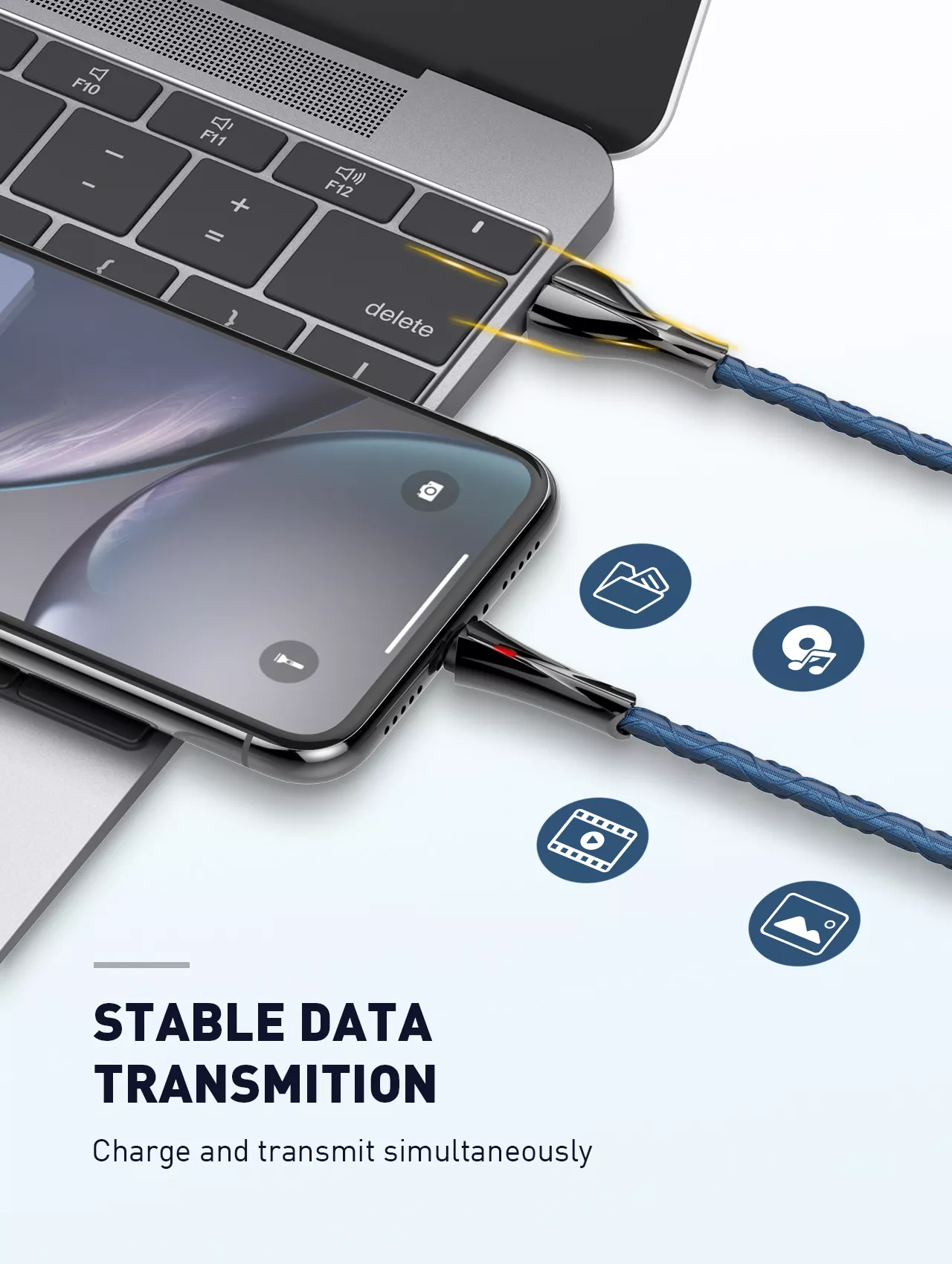 Kabel USB oprócz ładowania obsługuje również szybką transmisję plików np. obrazów, filmów, dokumentów. Możesz za jego pomocą przesyłać dane między urządzeniami i nie trwa to tak długo jak w przypadku standardowych kabli USB konkurencji.