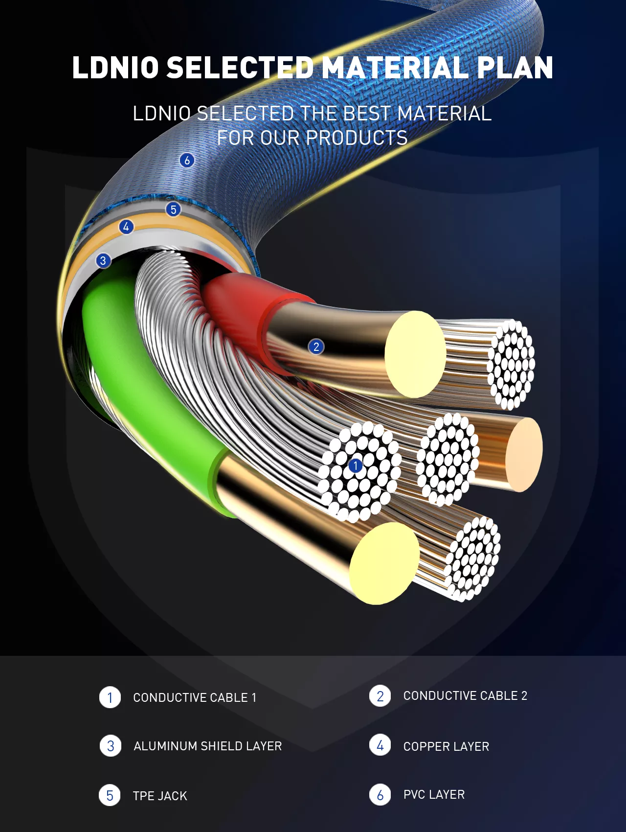 Kable USB LDNIO są odporne na zużycie, gięcie i dodatkowo są wykonane z niepalnego materiału. Zapobiega to szybkiemu złamaniu się kabla, tak jak to ma często miejsce w przypadku innych kabli. Oplot kabla jest stworzony z warstwy TPE (termoplastyczny elastomer poliestrowy), który jest odporny na temperatury i chemię, a także umożliwia bezodpadowe przetwarzanie, co jest ważne dla środowiska - z powodzeniem zastępuje gumę czy lateks. Wykonany z kabli miedzianych i izolacji z elastycznych materiałów.