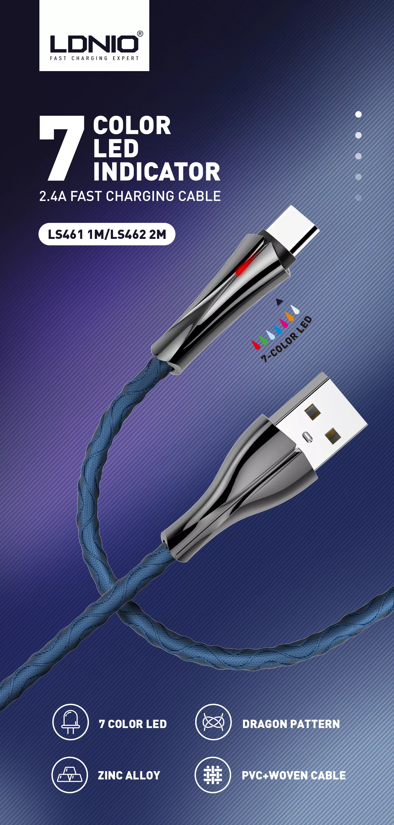 Kable szybkiego ładowania marki LDNIO, obsługuje szybkie ładowanie i transmisję danych. Został zaprojektowany tak, aby posłużył użytkownikowi jeszcze dłużej! Ulepszony i wzmocniony interfejs może wytrzymać wielokrotne zginanie lub wyginanie, aby uniknąć złamania. Podczas produkcji wykorzystano przyjazne dla środowiska materiały, które są miękkie, elastyczne. Przewód charakteryzuje się szybszą przewodnością. Technologia FAST CHARGING pozwala naładować smartfon szybciej niż tradycyjne kable USB do telefonu. Unikalna dioda LED świeci w 7 kolorach, gdy kabel jest używany.