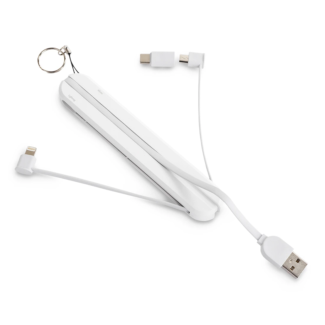 Trzy różne końcówki: microUSB, Apple Lightning 8pin i adapter do USB-C w wygodnym etui pozwolą na przechowywanie i transport jednego wygodnego etui zamiast trzech różnych kabli. Jest to wygodne rozwiązanie, jeśli posiadamy urządzenia z różnymi gniazdami. Krótki kabel i wysuwane za pomocą przycisku wtyki sprawdzą się w podróży, ponieważ zajmują mało miejsca.