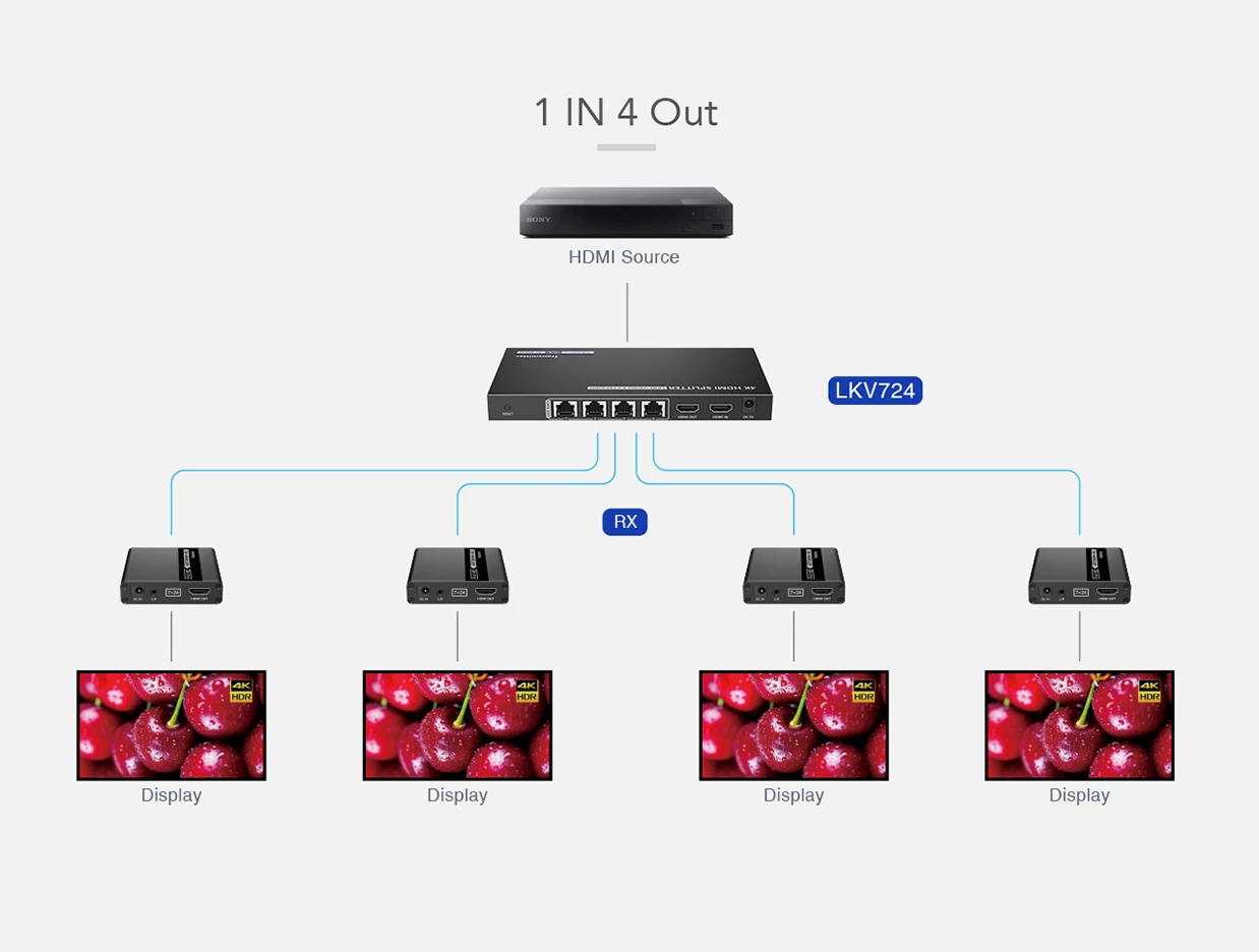 Rozgałęźnik HDMI 1/4 gwarantujący przesył sygnału z zerowym opóźnieniem w jakości 4K@30Hz na odległość do 40 metrów (70 metrów w jakości 1080p@60Hz). Transmiter wyposażony został w dodatkową przelotkę HDMI oraz port RS232 pozwalający na zewnętrzne zarządzanie urządzeniem. Rozgałęźnik idealnie sprawdzi się przy reklamach zewnętrznych, studiach, w klasach lekcyjnych etc.