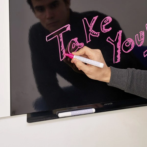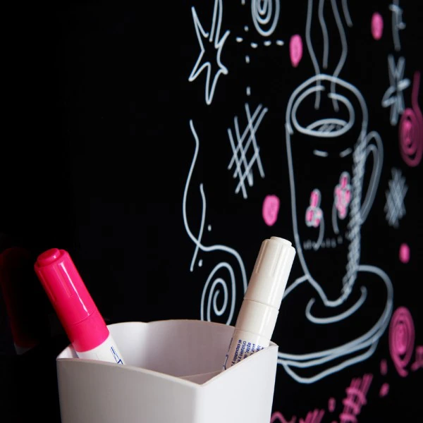 Po tablicy można pisać markerami suchościeralnymi. Twórz wykresy, rysunki, zapiski, dzięki którym lepiej przekażesz swoją wizję! Aby wytrzeć tablicę, możesz wykorzystać gąbkę, papierowy ręcznik — działa zarówno na sucho, jak i na mokro.