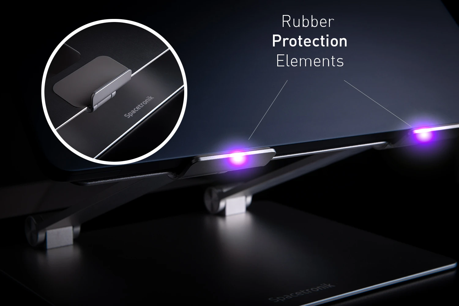 Podstawka została wyposażona w gumowane podkładki w newralgicznych miejscach. Tym samym zabezpieczając przed porysowaniem nie tylko biurko, ale również samo urządzenie.