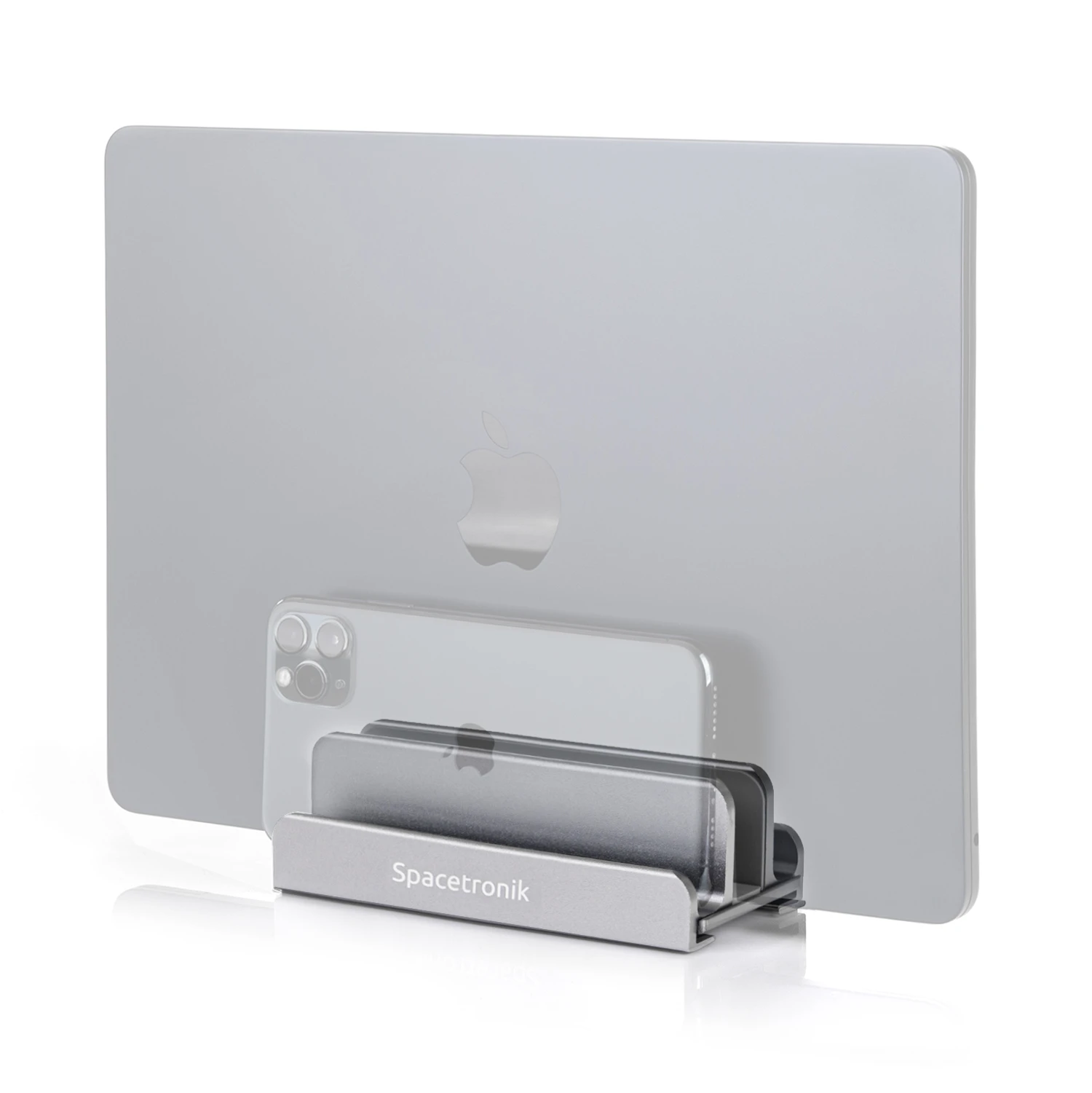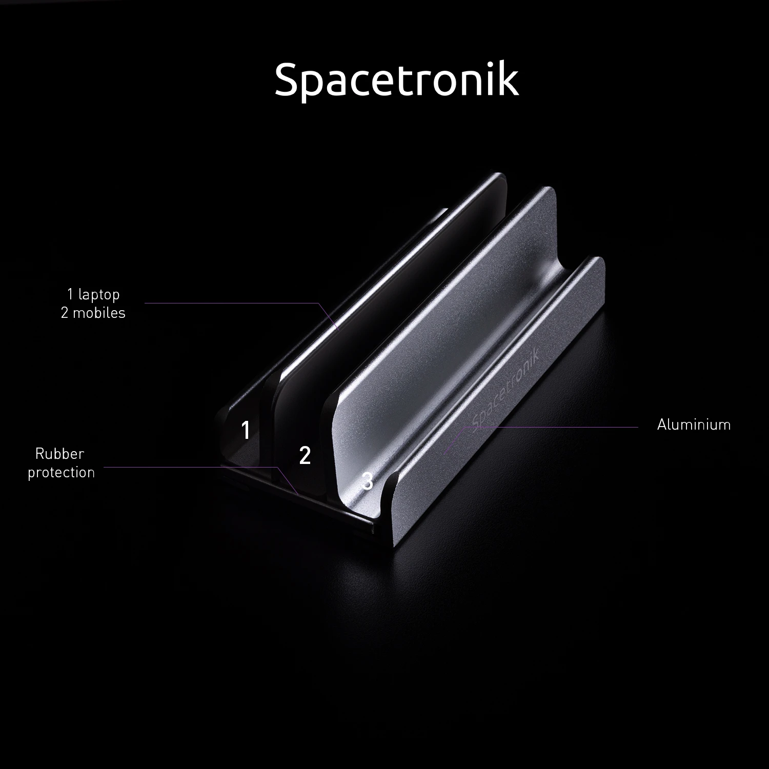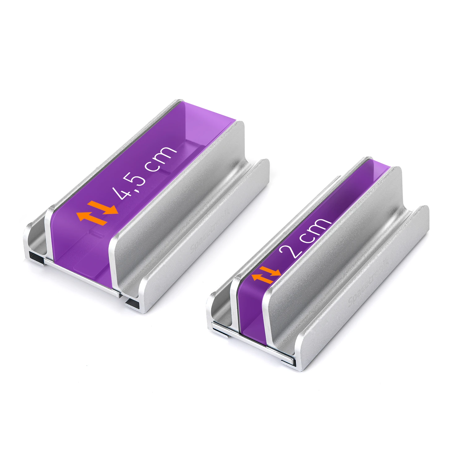 Bez różnicy czy masz grubego laptopa, czy wąskiego Maca, podstawka od Spacetronik posiada regulację szerokości uchwytu od 2 do 4,5 cm. Oprócz tego znajdują się w nim 2 miejsca na telefony komórkowe (każdy model się zmieści)