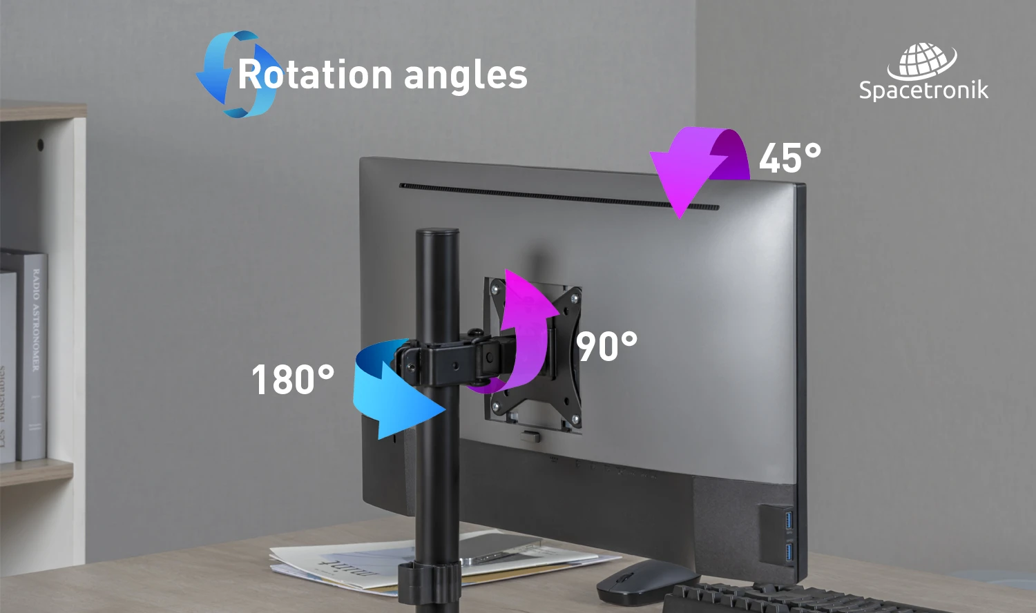 Konstrukcja o szerokim zakresie zapewniająca dużą regulację i kąty widzenia, możliwość ustawienia w orientacji pionowej lub poziomej.