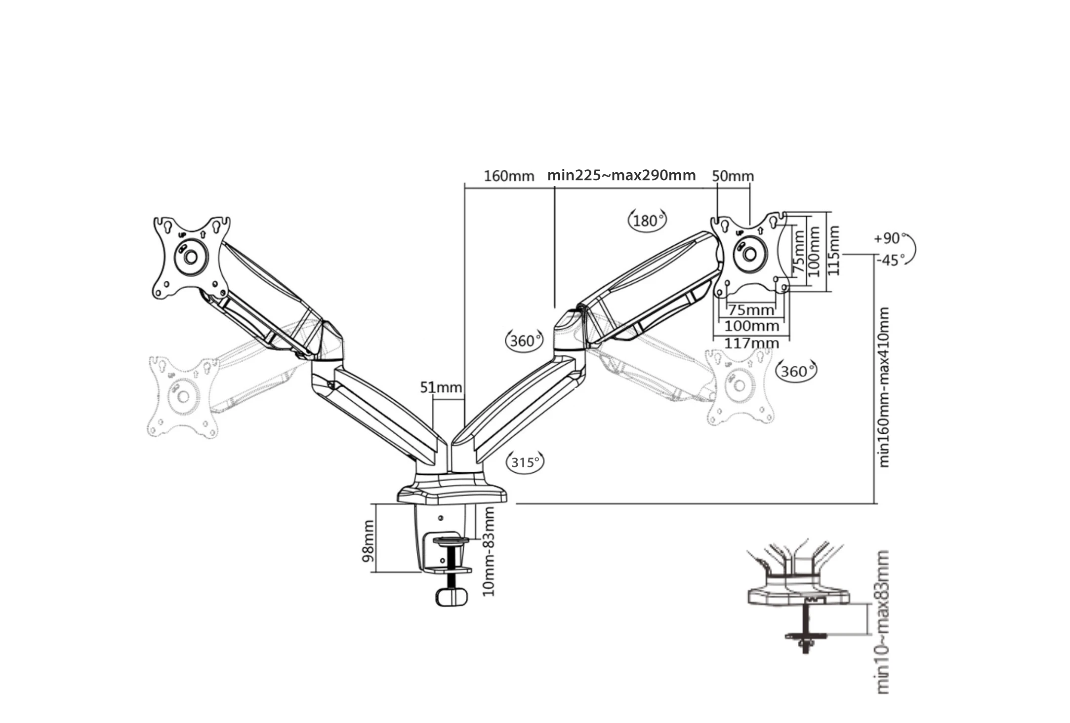 - Sugerowana grubość biurka: Zacisk: 10 ~ 85 mm Przelotka: 10 ~ 40 mm