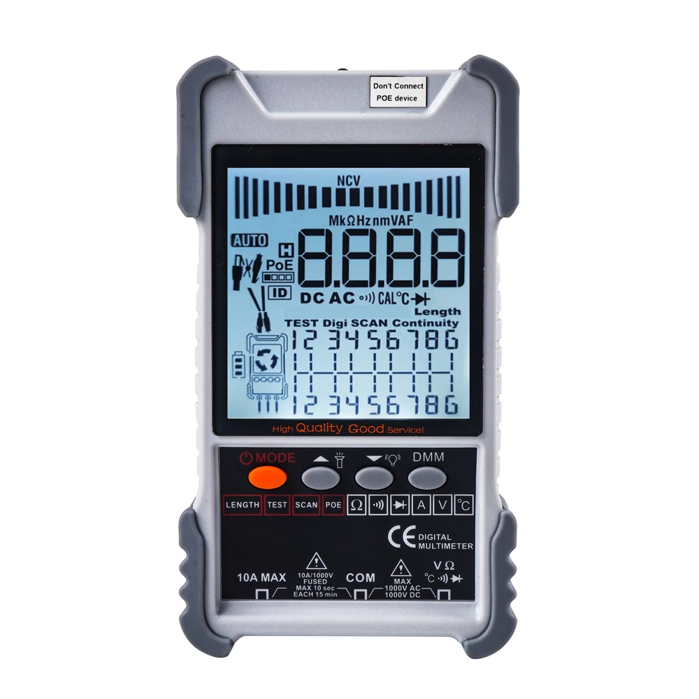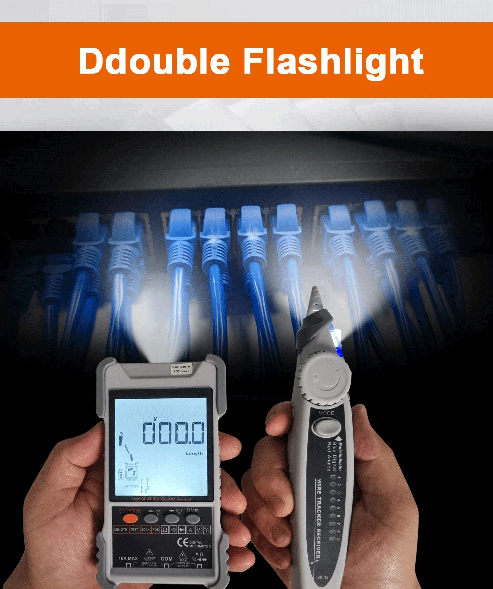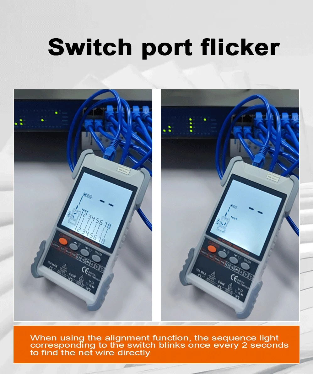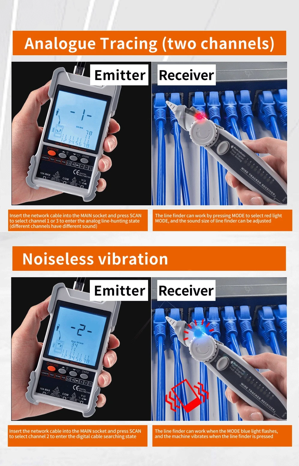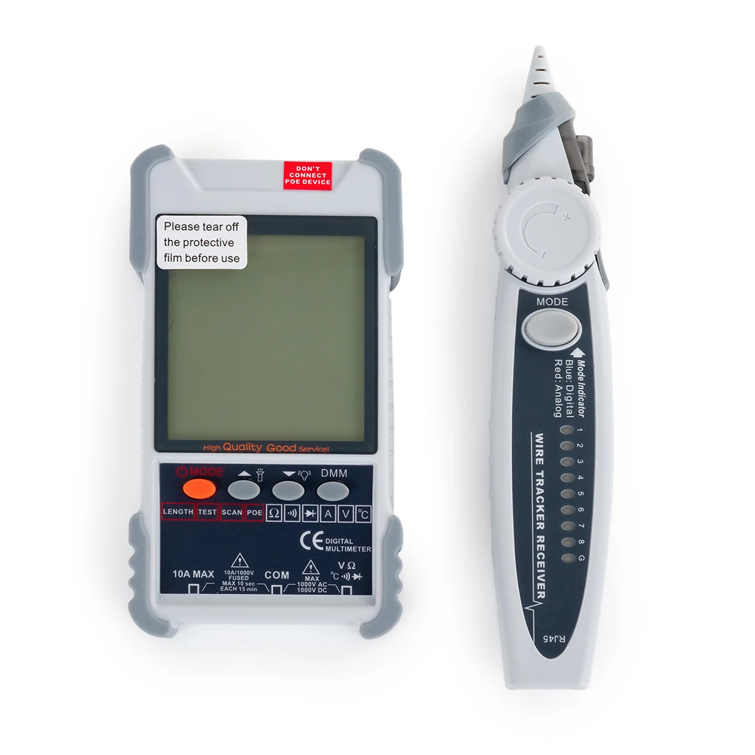 - Wielofunkcyjny tester kabli: Ten tester kabli ma funkcję śledzenia analogowego, mapowania kabli, pomiaru napięcia PoE, regulacji czułości śledzenia cyfrowego itp.