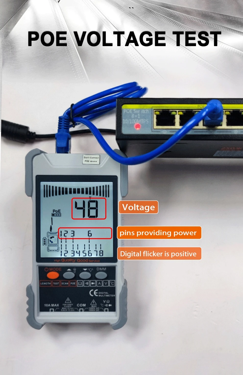 - Test POE: testy POE mogą sprawdzić polaryzację mapowania kabli i napięcie przełączników sieciowych POE.