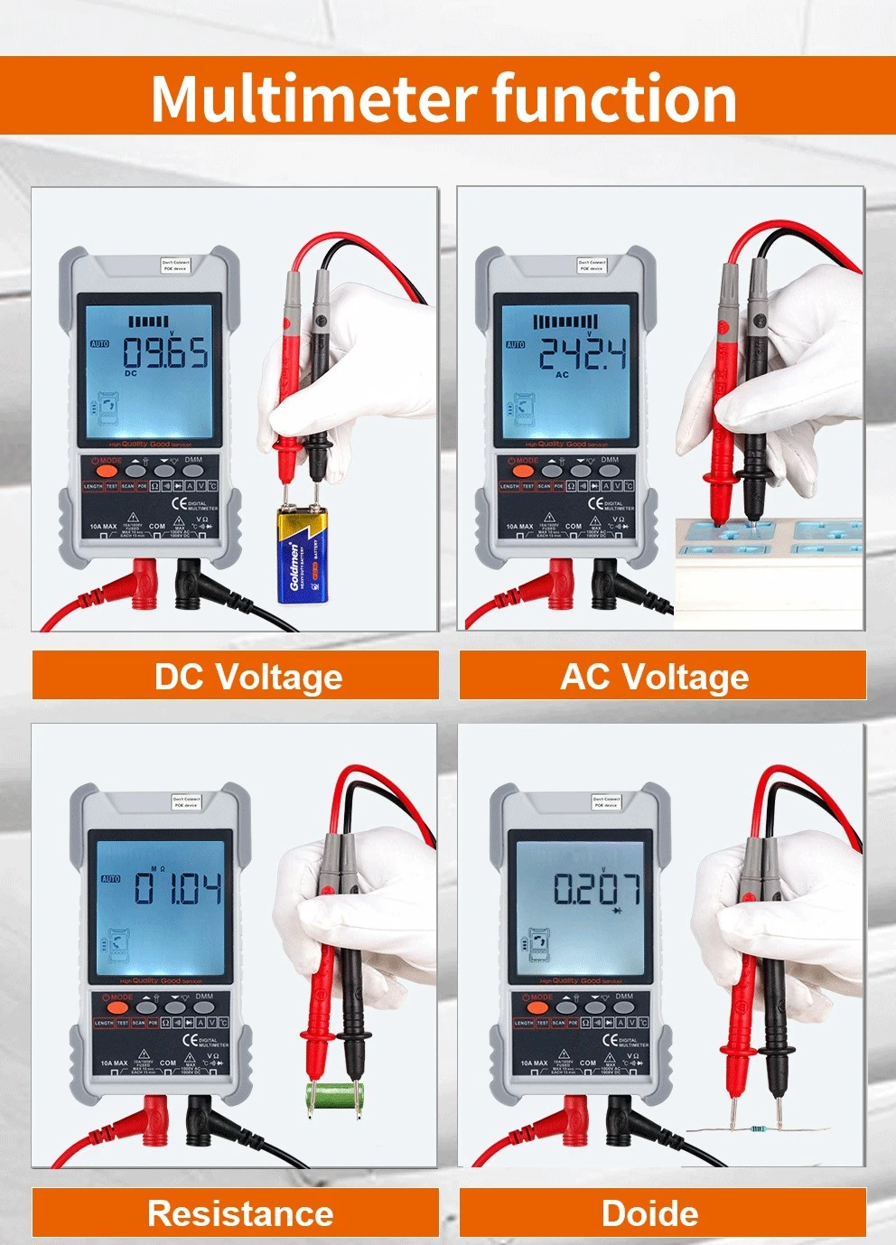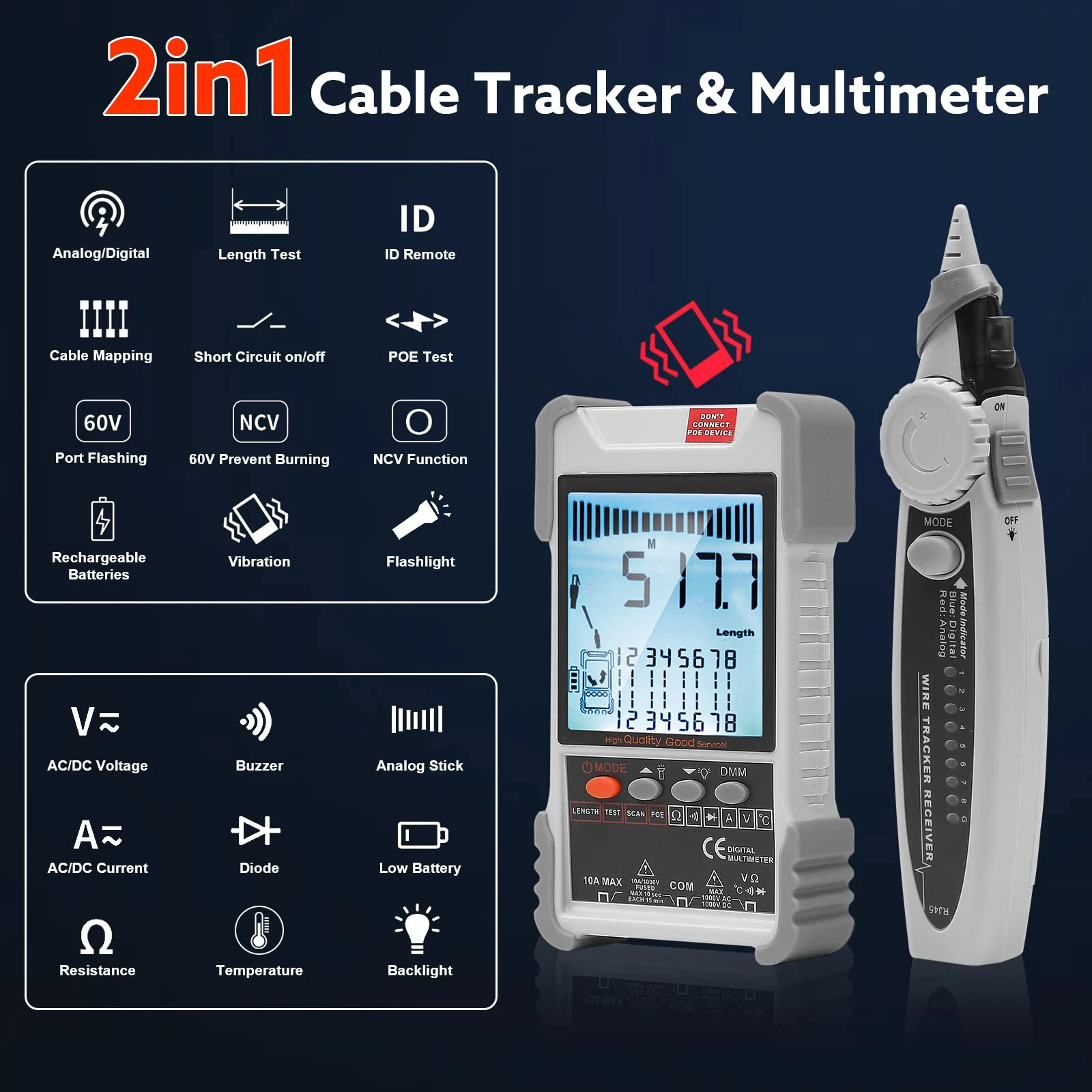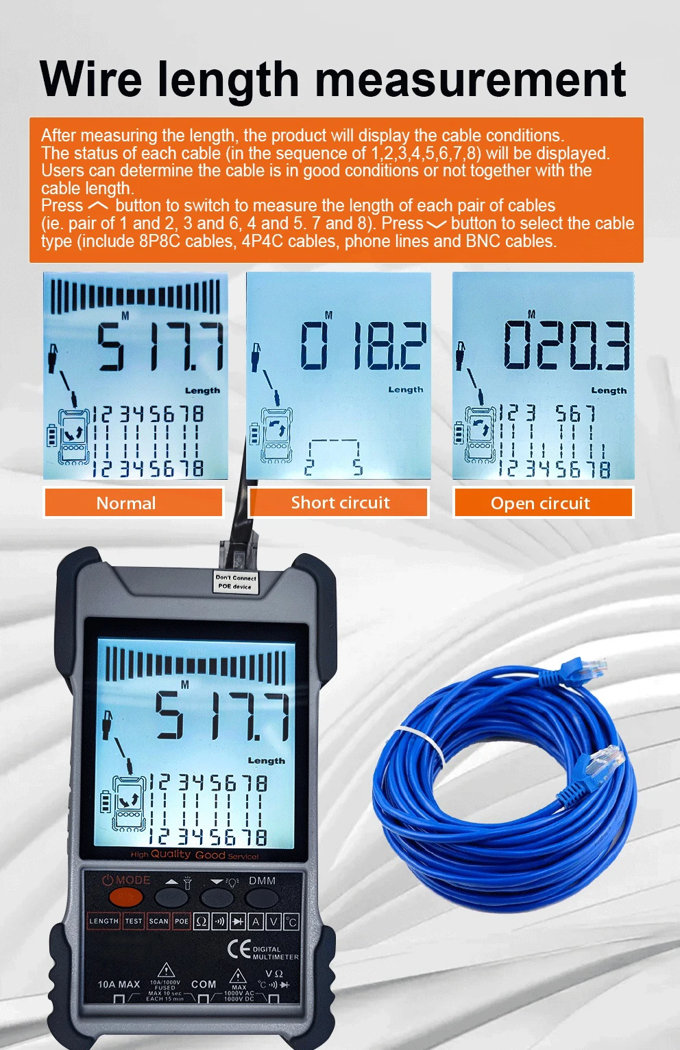 Ten miernik łączy w sobie funkcje śledzenia kabli i pomiaru długości kabli. Zaletą tego miernika jest duża odległość śledzenia wyraźnych sygnałów dźwiękowych szybki i precyzyjny pomiar długości kabla. Miernik jest praktycznym narzędziem dla laboratoriów, fabryk, instalatorów sieci radiowozów i techników. Może mierzyć długość kabla sieciowego, zwarcie i przerwę w obwodzie w czasie rzeczywistym. Funkcja śledzenia kabli może szybko i skutecznie znaleźć docelowy kabel w dużej liczbie kabli. Funkcję tę można wykorzystać w systemach telefonicznych, sieciach komputerowych, kablach BNC i innych metalowych kablach sieciowych.