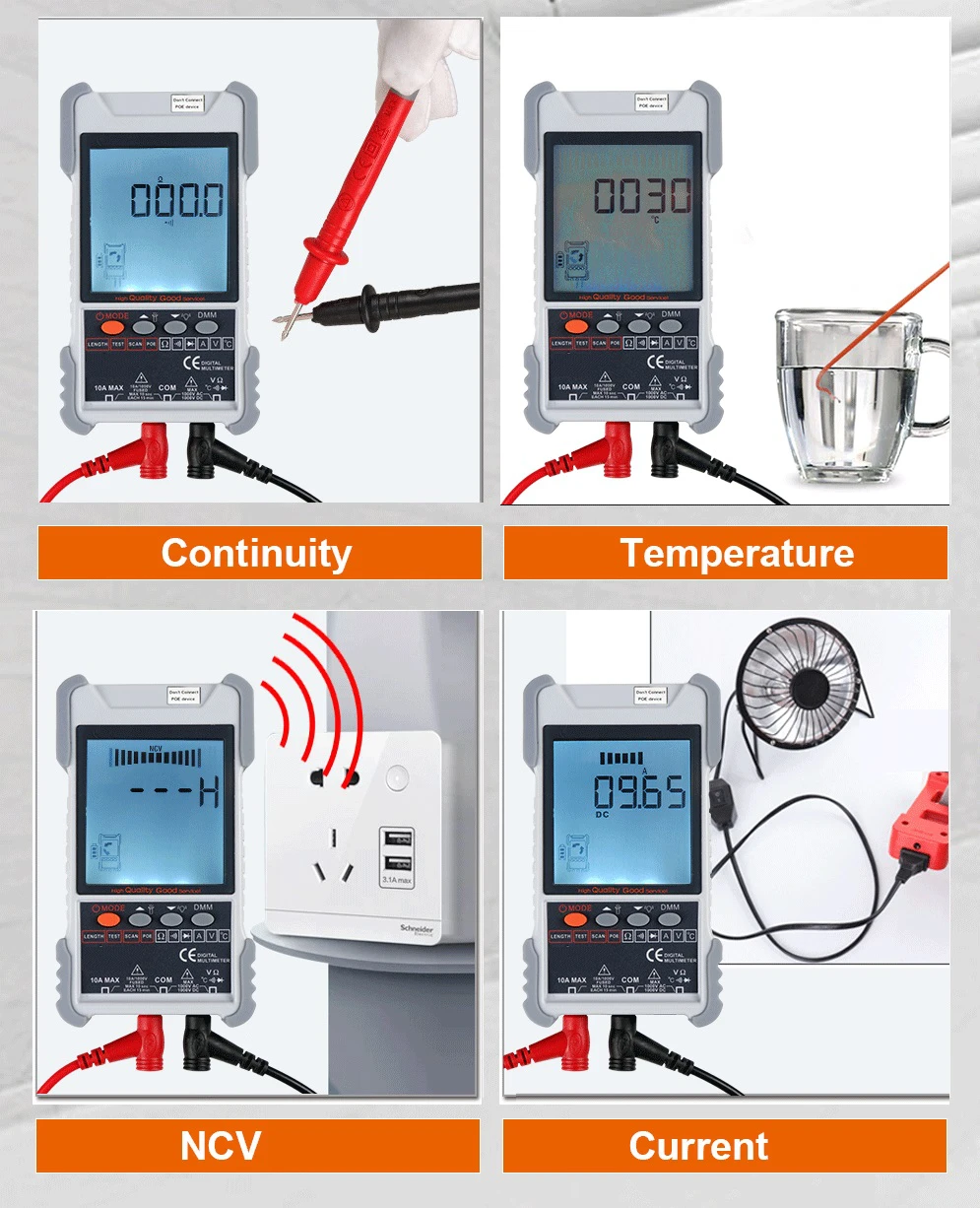 - Funkcja multimetru: Ta funkcja obejmuje pomiar prądu stałego i napięcia przemiennego oraz prądu, rezystancji, ciągłości, diody, pomiar temperatury.