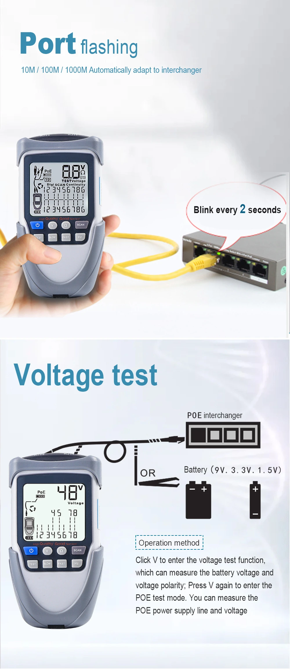 - Test POE: testy POE mogą sprawdzić polaryzację mapowania kabli i napięcie przełączników sieciowych POE.
