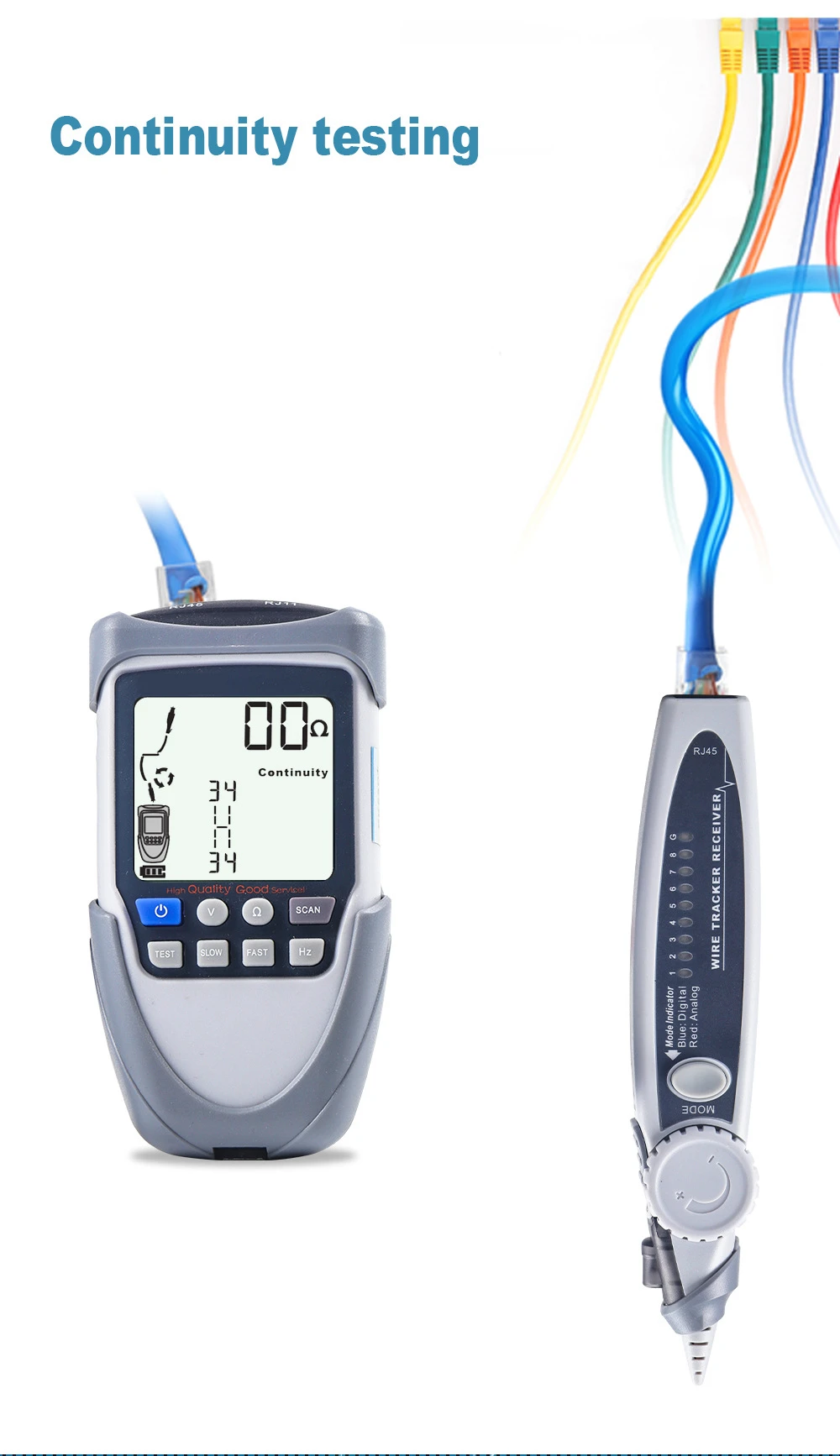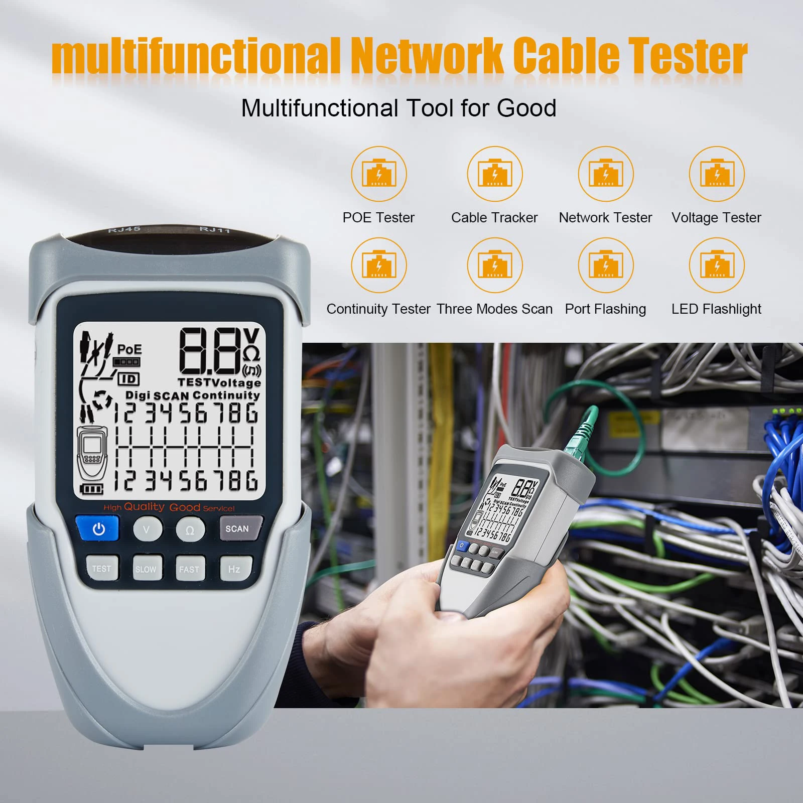 Ten tester kabli ma funkcję śledzenia analogowego, mapowania kabli, pomiaru napięcia PoE, regulacji czułości śledzenia cyfrowego itp. Miernik jest wyposażony w duzy czytelny ekran LCD, powiadomienia vibracyjne, oraz światło LED poprawiające znaczaco komfort pracy.