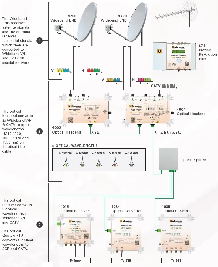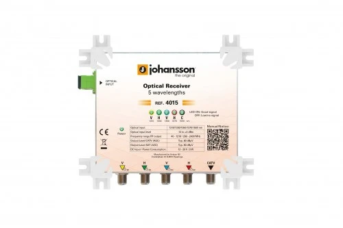 Odbiorniki optyczne opracowane do transmisji sygnałów szerokopasmowych w średnich i dużych instalacjach światłowodowych. Odbiornik optyczny może konwertować jeden, dwa lub trzy długości fal. Ref. 4011 (optyczny pojedynczy odbiornik) konwertuje 1550nm na sygnał satelitarny lub CATV. Ref. 4012 (podwójny odbiornik optyczny) konwertuje 1310 + 1330 nm na szerokopasmowy V/H; Ref. 4013 (potrójny odbiornik optyczny) konwertuje 1310 + 1330 + 1550 nm do szerokopasmowego sygnału V/H i CATV. Ref. 4014 (potrójny odbiornik optyczny) konwertuje 1350 + 1370 + 1550 nm do szerokopasmowego sygnału V/H i CATV.