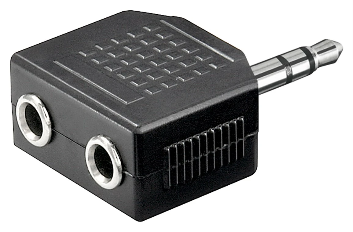 Adapter, łącznik dwóch gniazd Jack 3,5mm (minijack, stereo) na jeden wtyk Jack 3,5mm (mały jack, stereo).