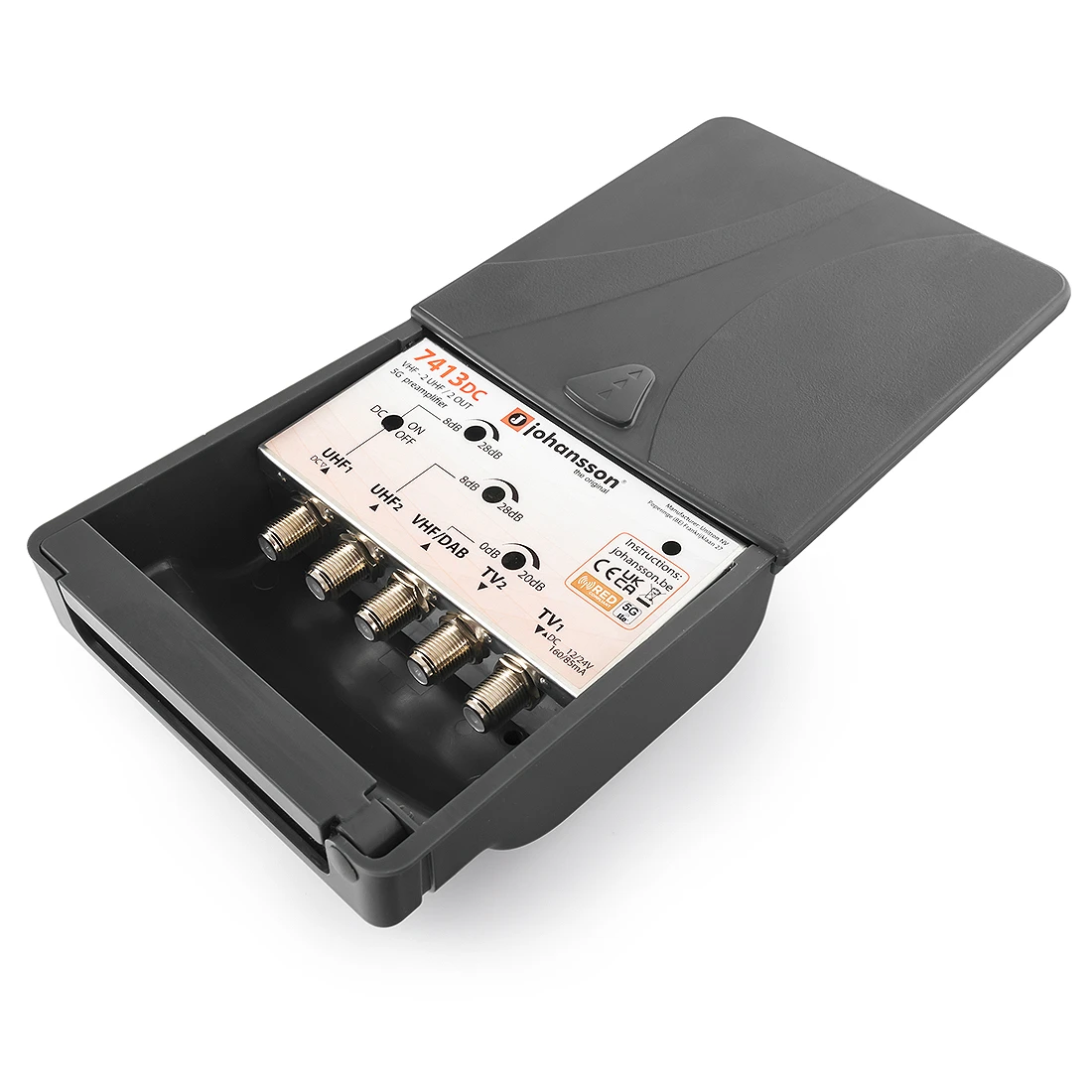 VHF: 0-20dB / 2xUHF: 8-28dB / 2 wyjścia / Ch21-48 LTE(5G) / Przełączane zasilanie DC / 12-24VRegulowany zakres wzmocnienia: VHF: 0-20dB / 2x UHF: 8-28dB (K. 21-48 LTE 5G)