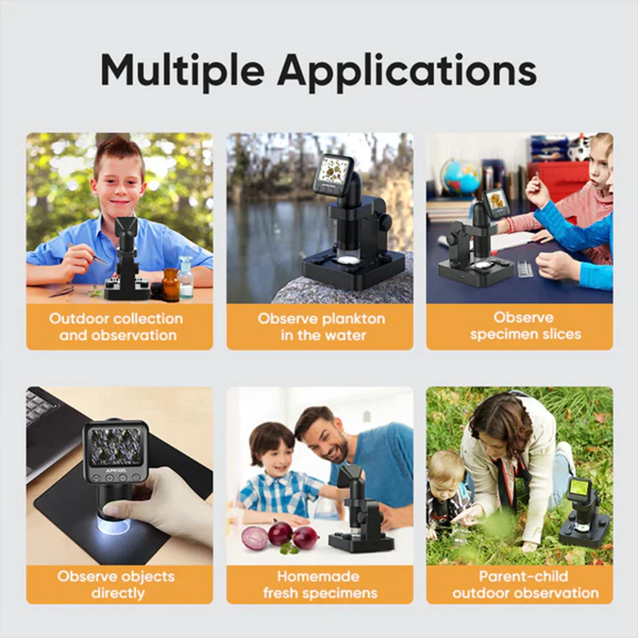 Mikroskop Apexel MS003 to doskonałe narzędzie dla nauczycieli, rodziców, dzieci oraz pasjonatów nauki i przyrody. Sprawdzi się w badaniach biologicznych, testowaniu jakości wody, obserwacji roślin i owadów czy rozwijaniu interakcji rodzic-dziecko.