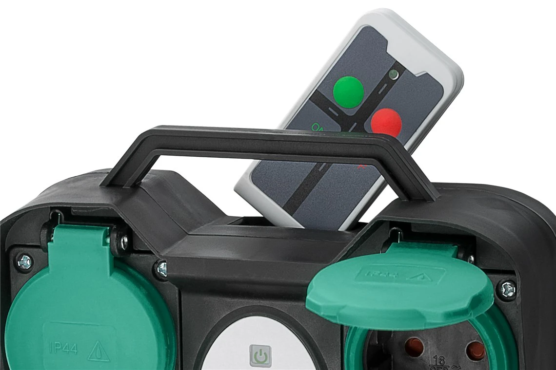 Gniazda sieciowe dedykowane do użytku zewnętrznego, z klapką, AC 230V. Wbijane w ziemię, dwie sztuki na jednym kołku/szpicy. W zestawie pilot do zdalnego włączania gniazd. Z ochroną przed porażeniem, zgodne z normą IP44.