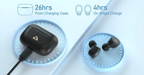 Pełne naładowanie słuchawek Bluetooth E302 zajmuje około godziny i może zapewnić do czterech godzin użytkowania na jednym ładowaniu. Pełne naładowanie etui ładującego trwa około 1,5 godziny i może ładować słuchawki sześć razy, co daje w sumie 30 godzin odtwarzania. Dołączony kabel ładujący USB typu C umożliwia ładowanie etui przez dowolny komputer, laptop lub ładowarkę z portem USB.