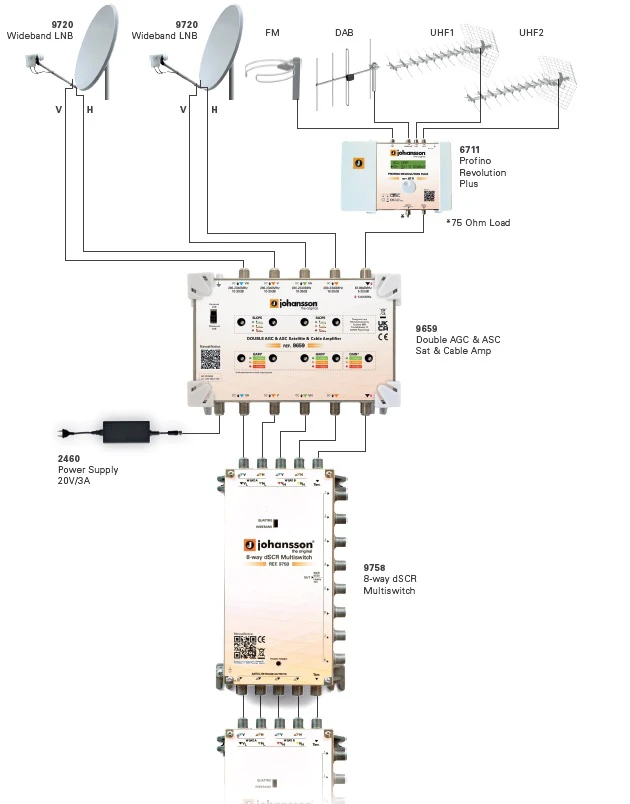 Johansson 9659 - podwójny wzmacniacz satelitarny i naziemny z AGC i ASCIdealny wzmacniacz do systemów multiswitchowych z torem kablowym/naziemnym.