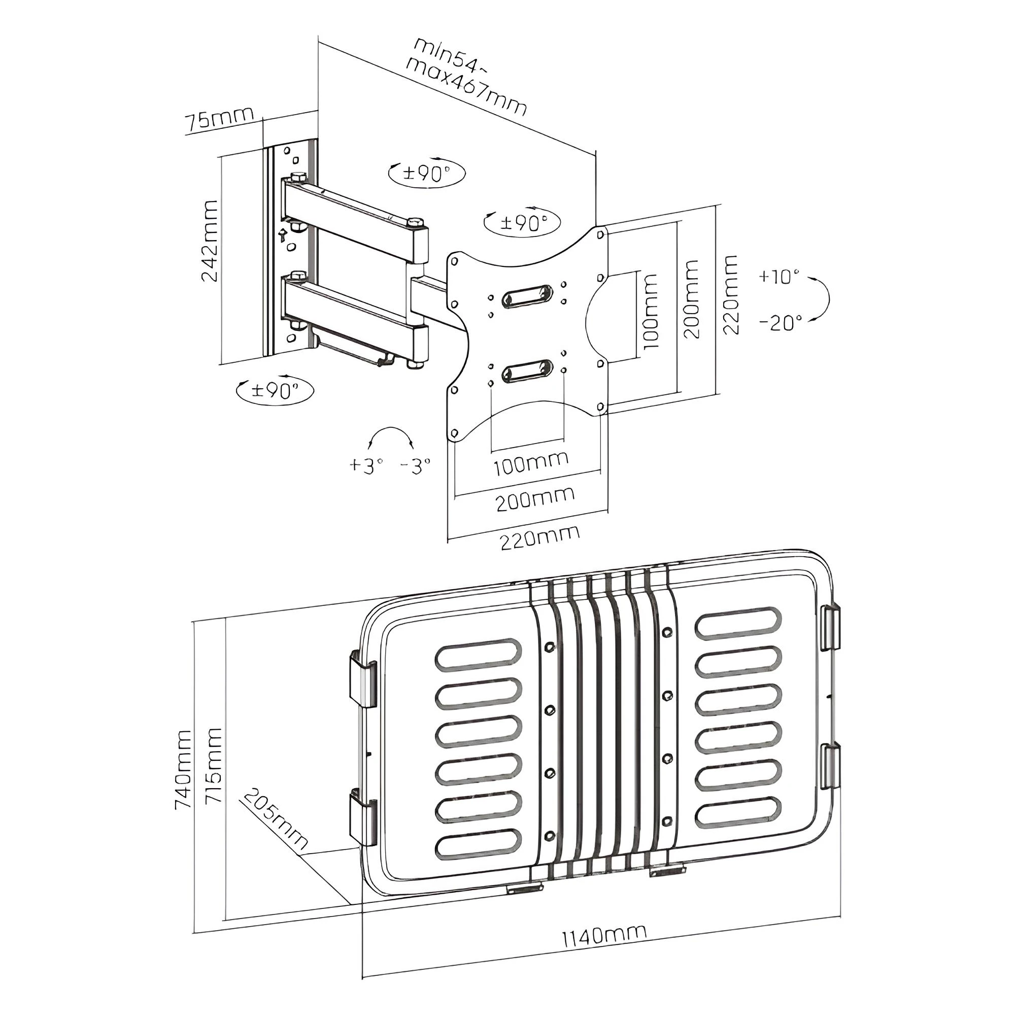 Obudowa na telewizor Spacetronik SPE-T20_43 pasuje do większości telewizorów w przedziale od 23 do 43 cali. Dodatkowo jest ona zgodna ze standardem VESA 100×100, 200×100, 200×200. By zapewnić Ci pełną swobodę z korzystania z urządzenia, ekran nachyla się w zakresie +10~-20°. Możesz go również obracać o 90° w obu kierunkach. Poziom natomiast ustawisz w przedziale od +3 do -3°.